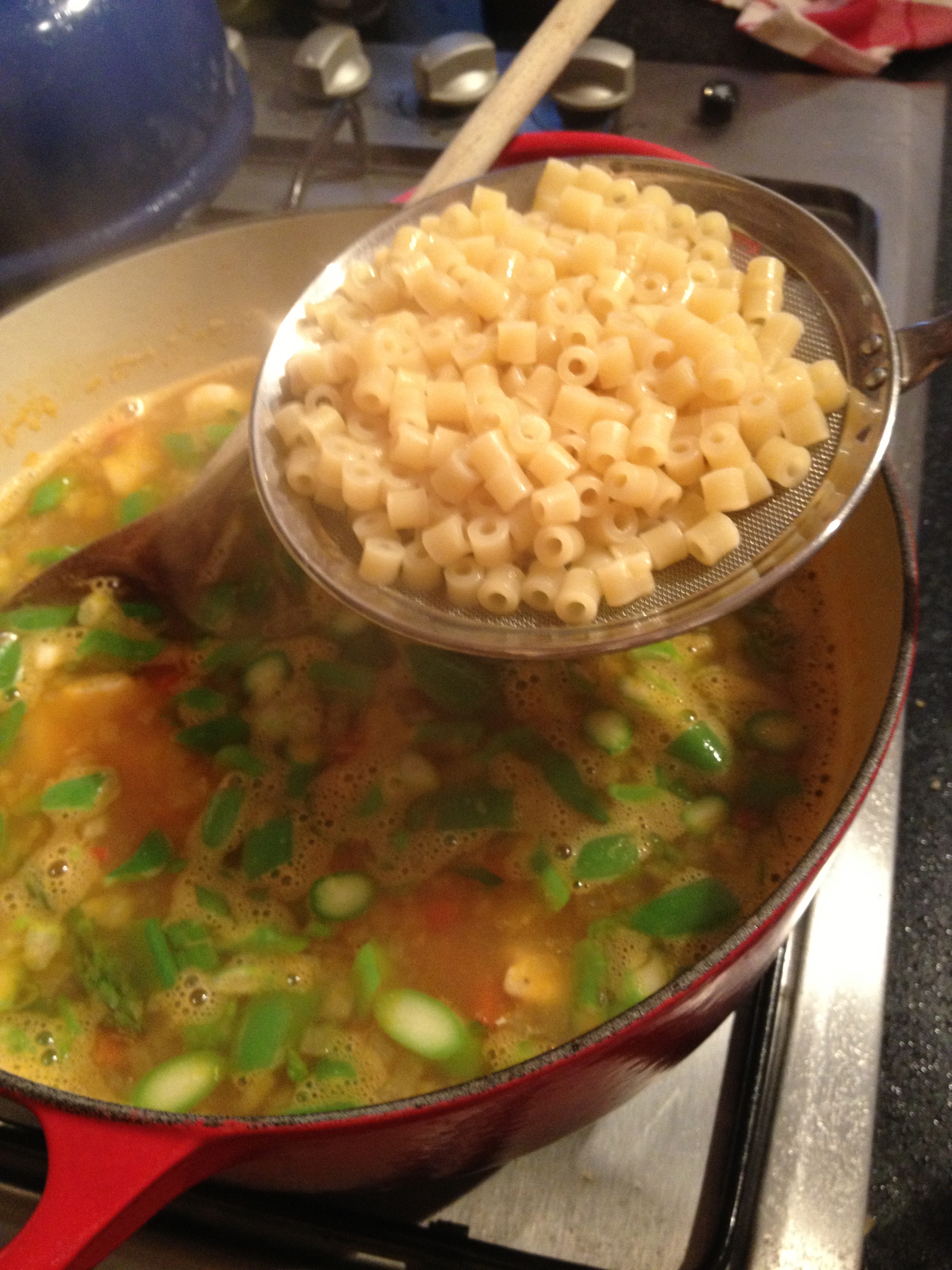 When you are almost ready to serve, add the rest of the vegetables and the drained pasta. This way they don’t over cook!