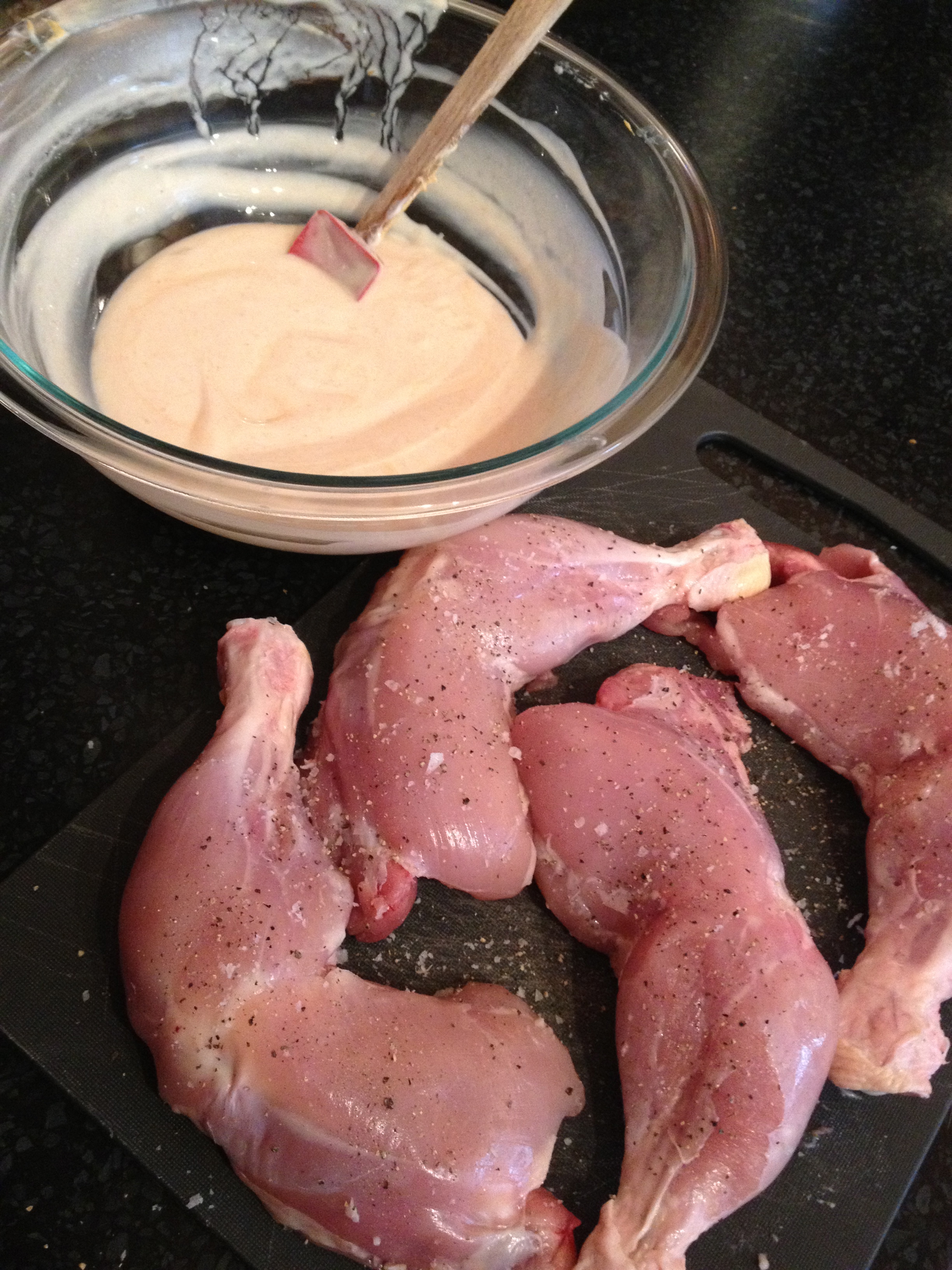 In a large bowl, mix together the buttermilk, Dijon, & hot sauce. Prepare the chicken legs by removing all skin and then sprinkling with salt and pepper. Add to the bowl to coat. Place in the fridge to marinate for 3-4 hours.