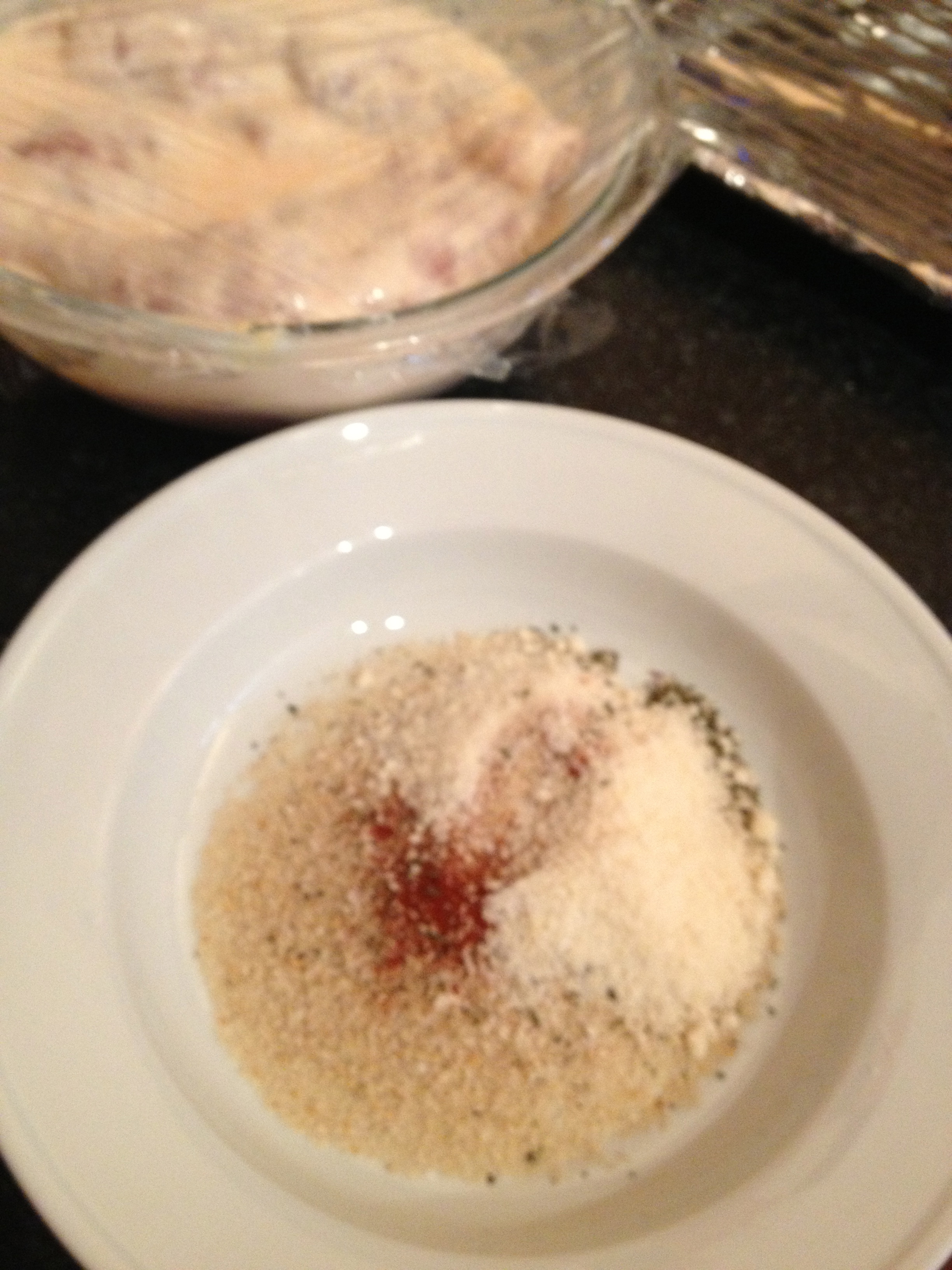 When you are ready to dredge your chicken, remove the excess buttermilk and toss in a bowl with the breadcrumb mixture. Or feel free to throw it all in a clean paper bag and literally shake then bake.