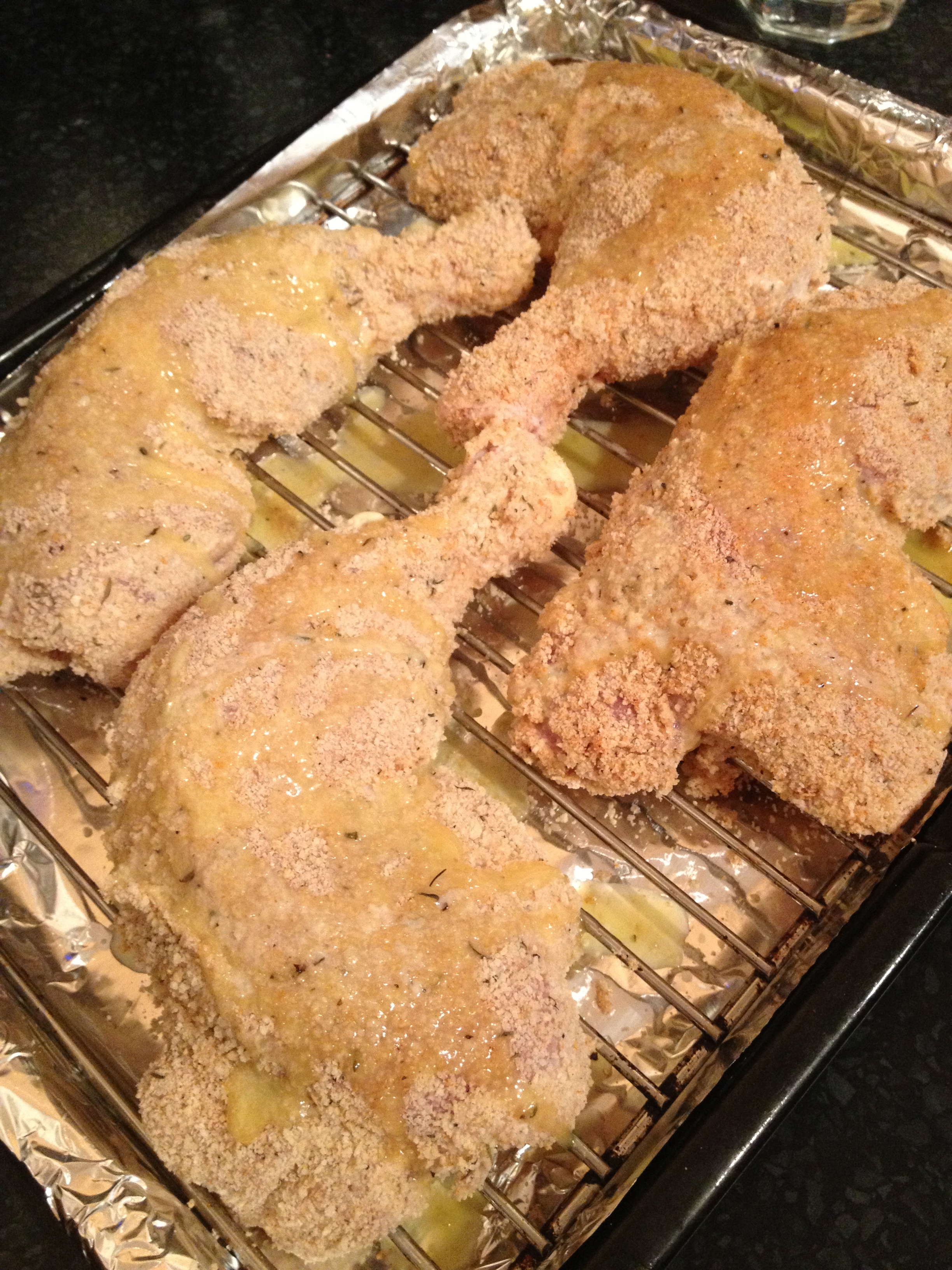 Shake off excess buttermilk, then dredge the chicken legs in the breadcrumbs, coating evenly. Place on the wire rack. Once all chicken legs are coated, drizzle evenly with melted butter.