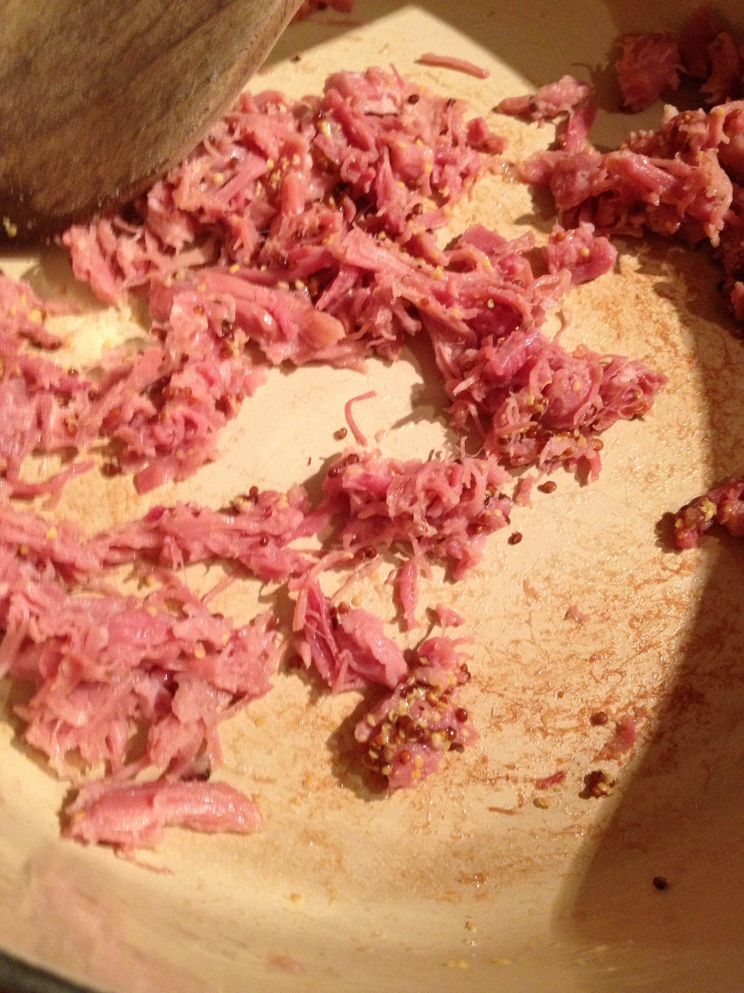 To begin, I heat some shredded ham hock with good whole grain mustard.