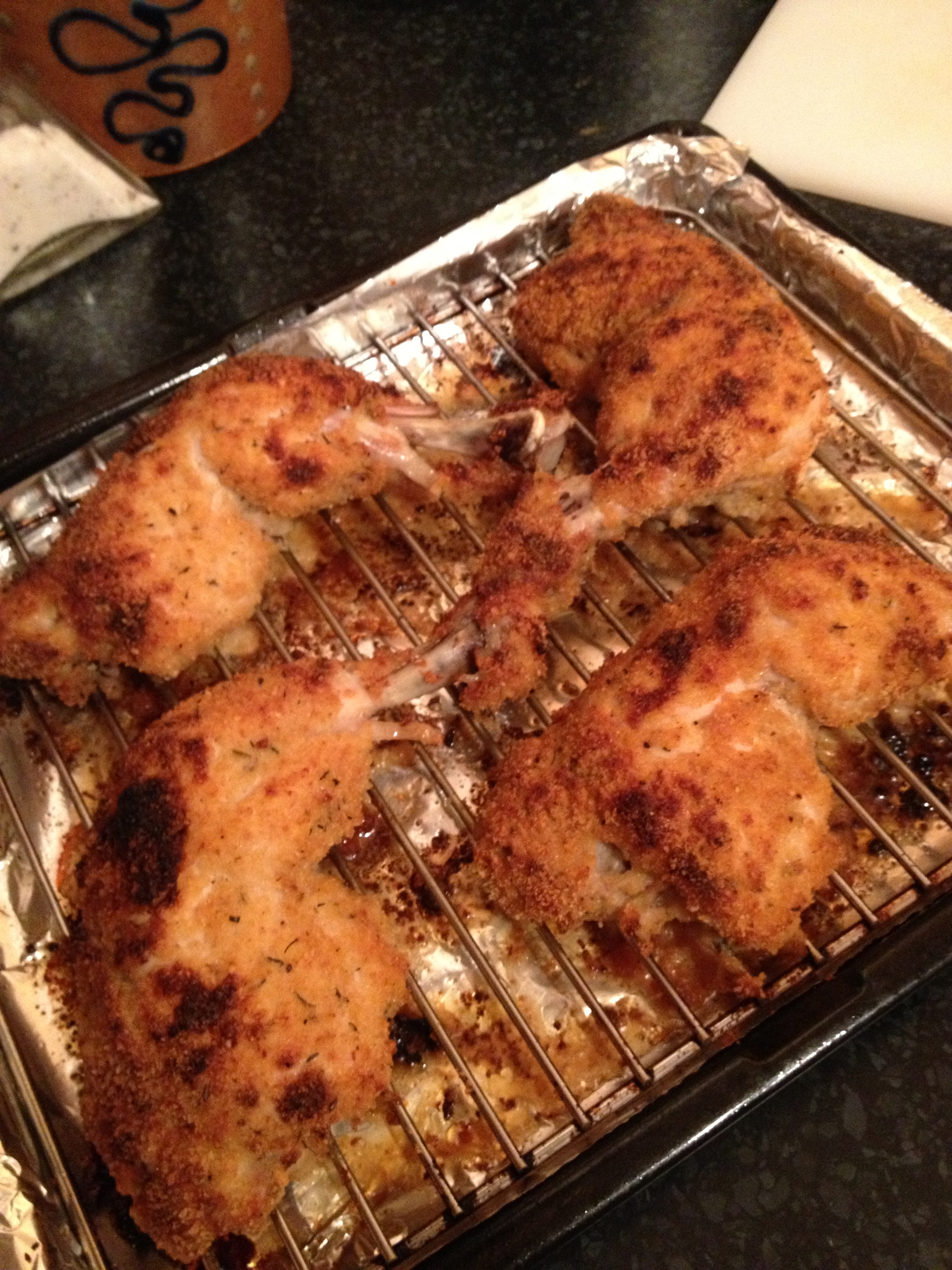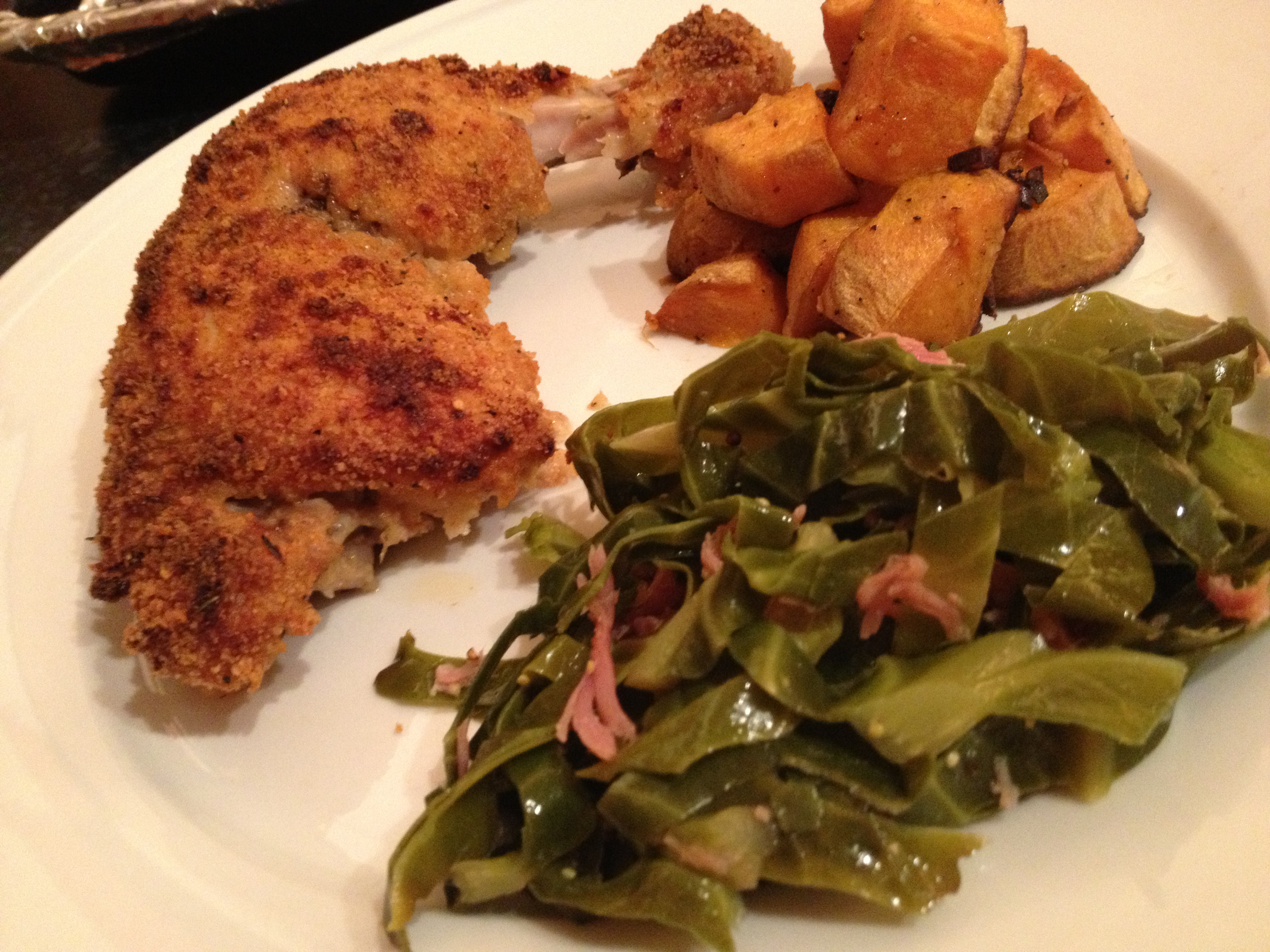 Before I head out though, and I am leaving now, really, I swear… I wanted to share last night’s dinner “journey”… it was half time warp, half teleport to the South, with my Shake-N-Bake-Oven-Fried Chicken and Mustard-Studded Ham Hock Greens.