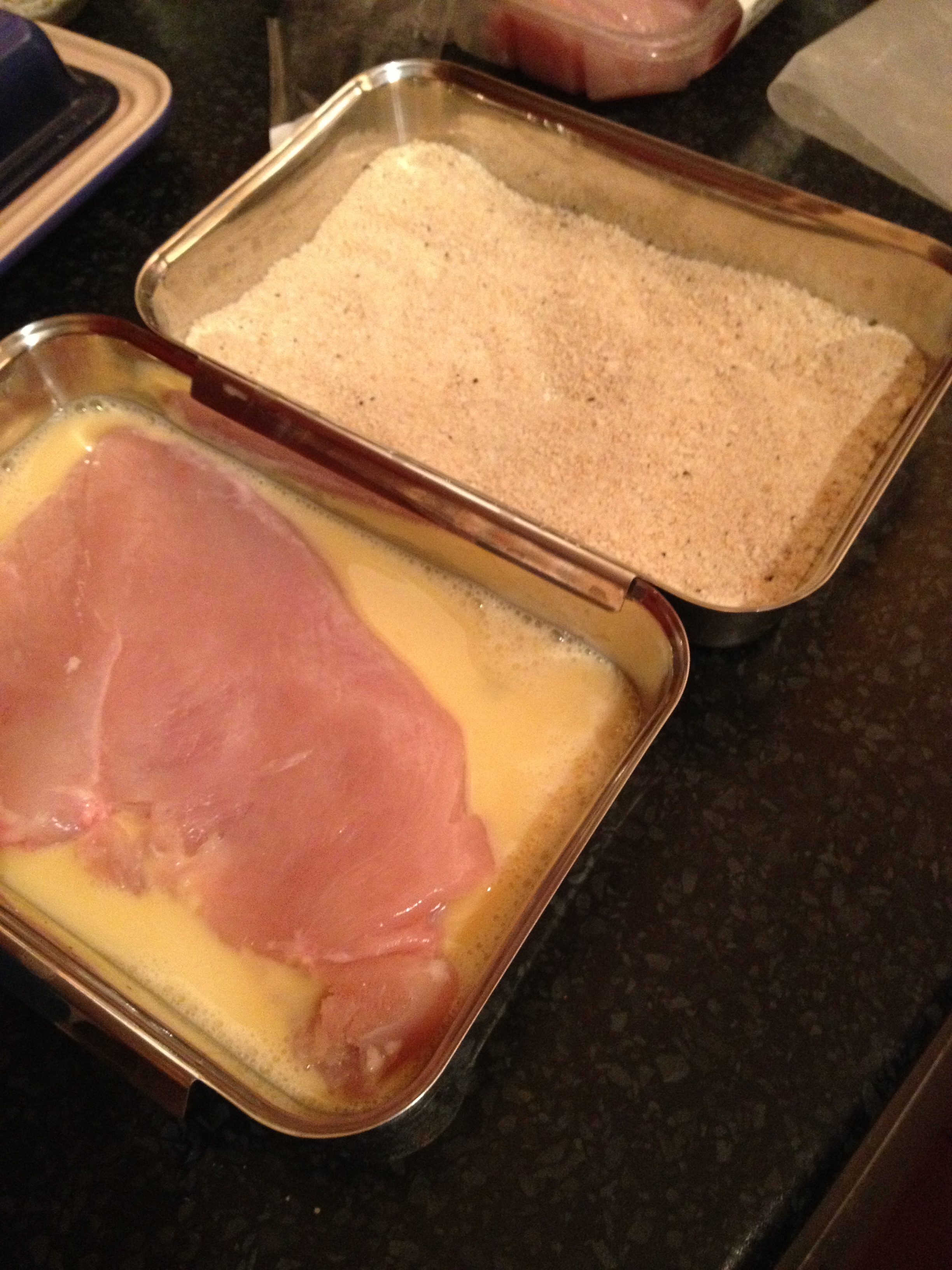 Dredge the chicken into the egg, then the breadcrumb mixture, then back into the egg and a second time into the breadcrumbs. This will evenly and well coat the chicken.