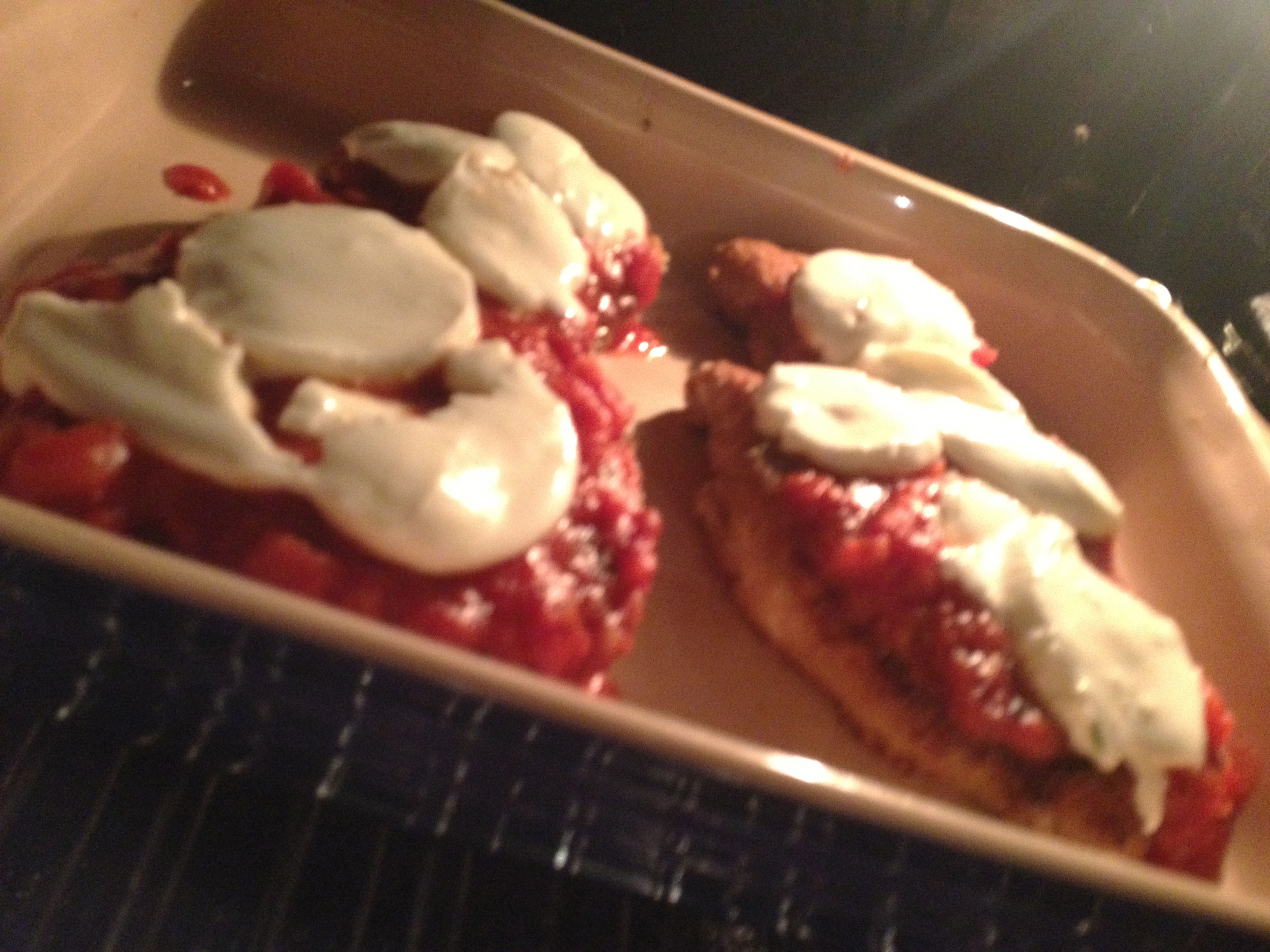 Remove and place onto a baking dish. Spreas about 1/3 cup of tomato sauce onto each breast and then cover with mozzarella slices. Bake in the oven for 10 minutes, until the cheese is melted and bubbly.