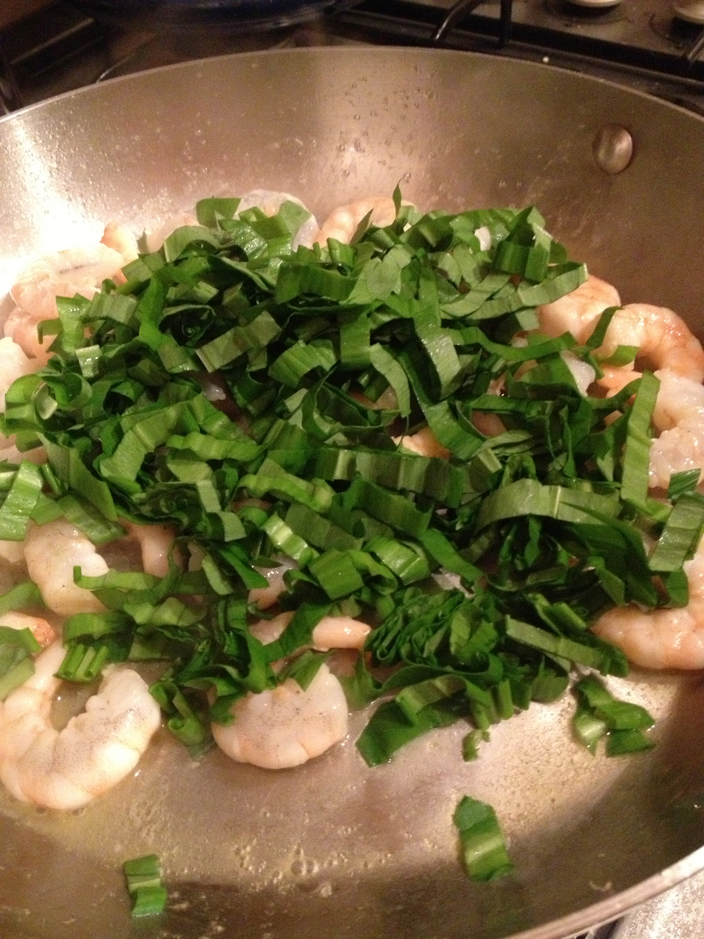 Melt butter and olive oil in a skillet then add the shrimp. Pour in the wine and simmer. If your shrimp are large, wait until you flip the shrimp to add the wine. You just want to be sure to give it a few minutes to reduce but not overcook the shrimp. After the shrimp is half cooked toss in the ramps and continue until the shrimp just turn pink all over.