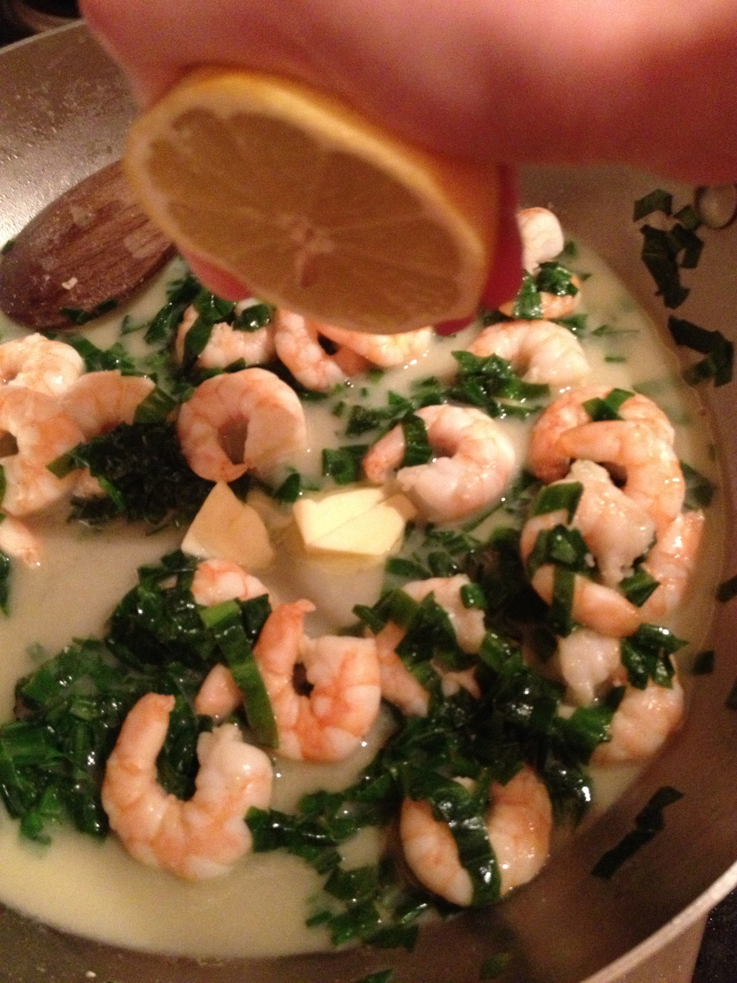 Add olive oil and 1 tablespoon of butter in a large skillet over medium heat. Once the butter has melted, add the shrimp and cook until the first side just turns pink. Flip the shrimp and add the white wine to the pan, followed by the sliced ramps. Continue to cook until the shrimp are done, then turn off the heat and finish with the remaining tablespoon of butter and juice of half a lemon.