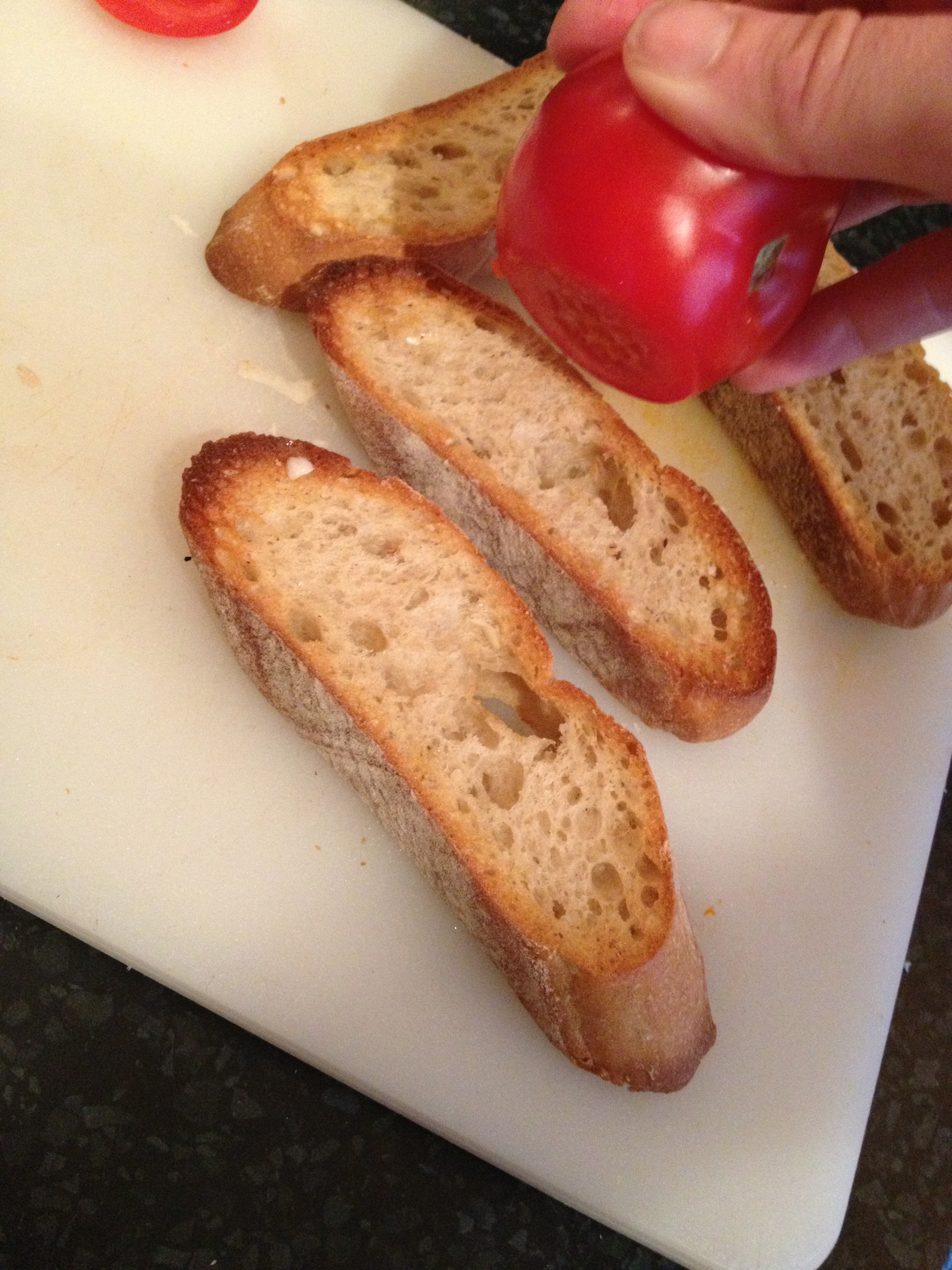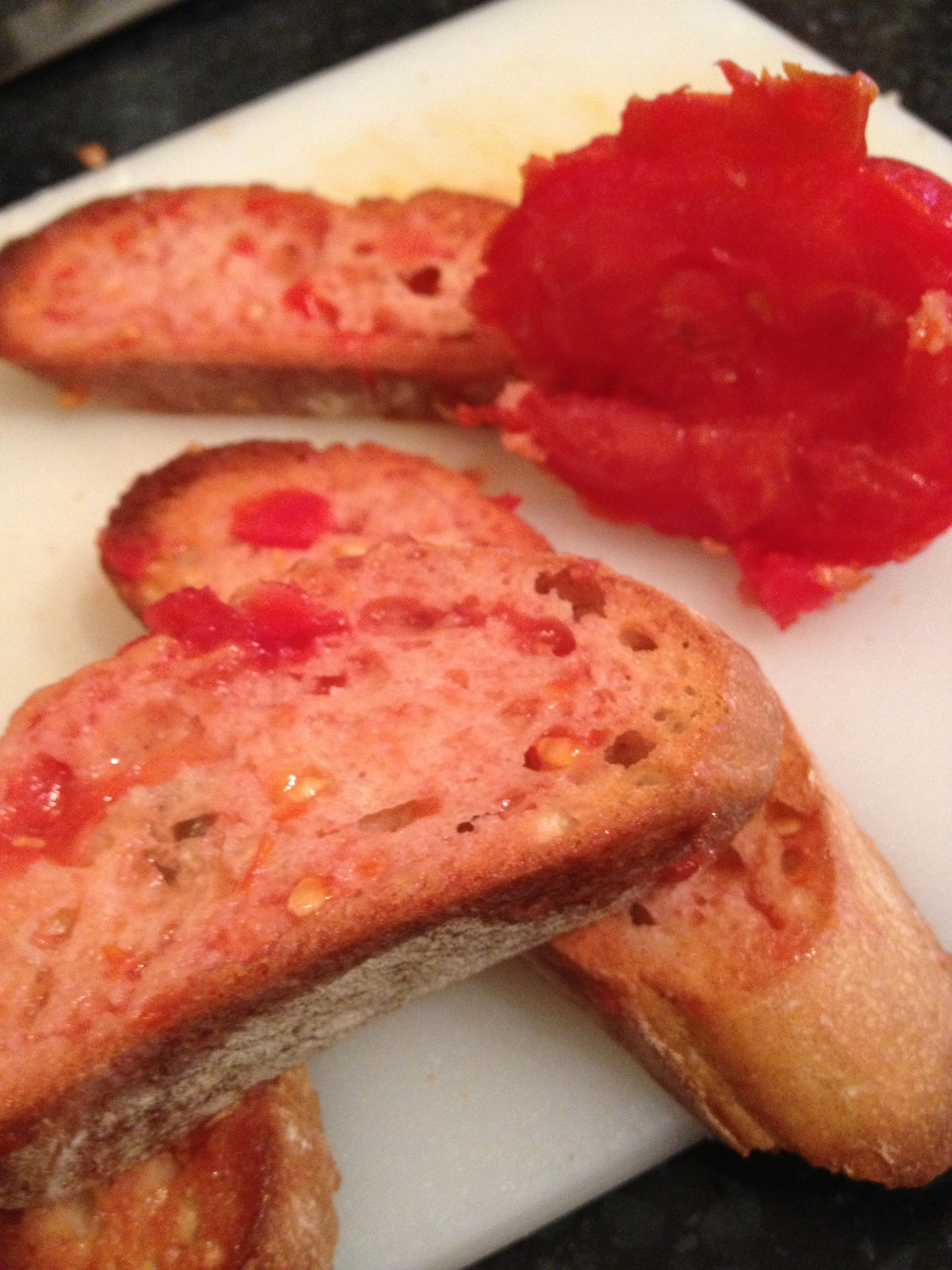 Rub aggressively (you need a well toasted bread for this) so that the tomato breaks down and the juices and pulp form almost a jam on the bread.