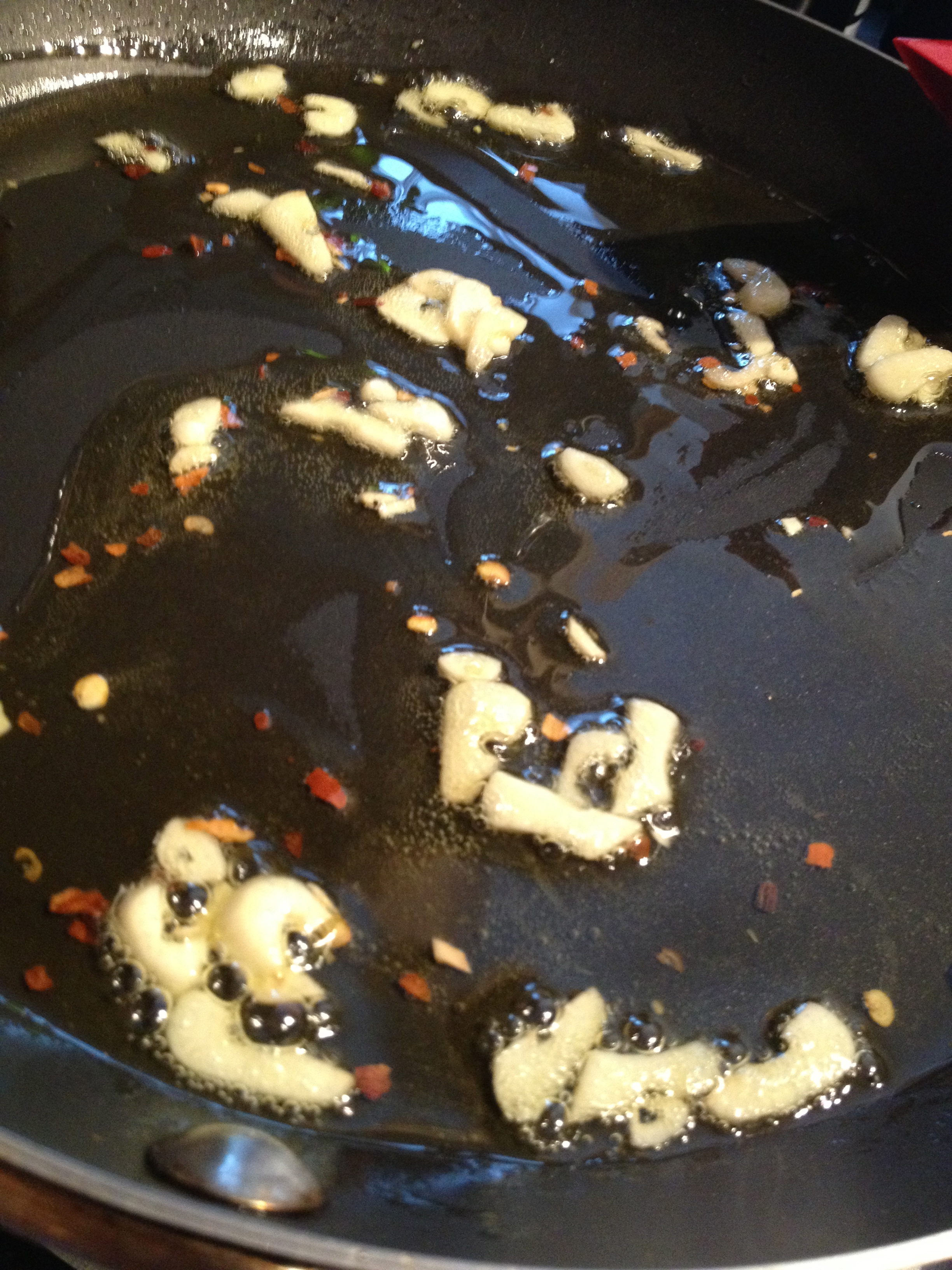 As the garlic just begins to sizzle add a pinch of red pepper flake and the shrimp. This way the garlic will be crispy, the oil infused, and the shrimp perfect!