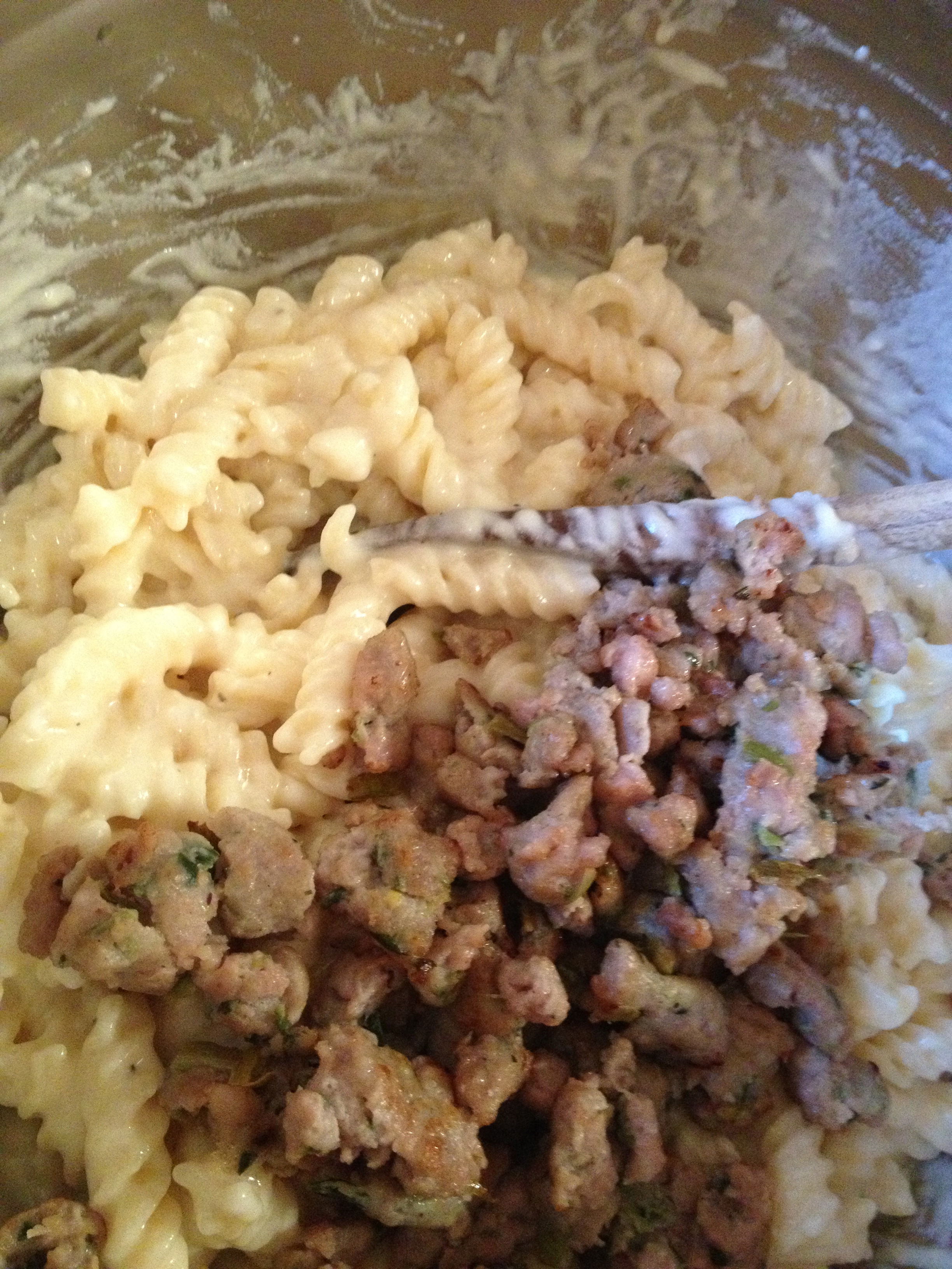 I also had on hand some pork sausage with leeks. The leeks added an awesome sweet onion flavor, so if you can’t find a sausage with these in them, I would sauté some thinly sliced leeks in with a mild sausage.