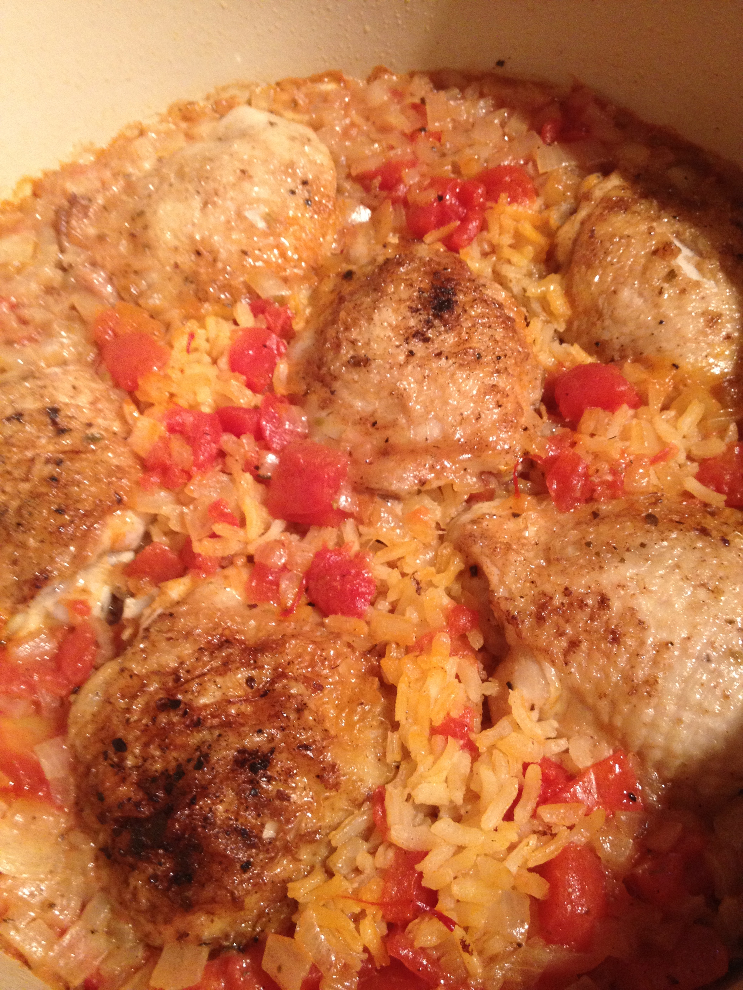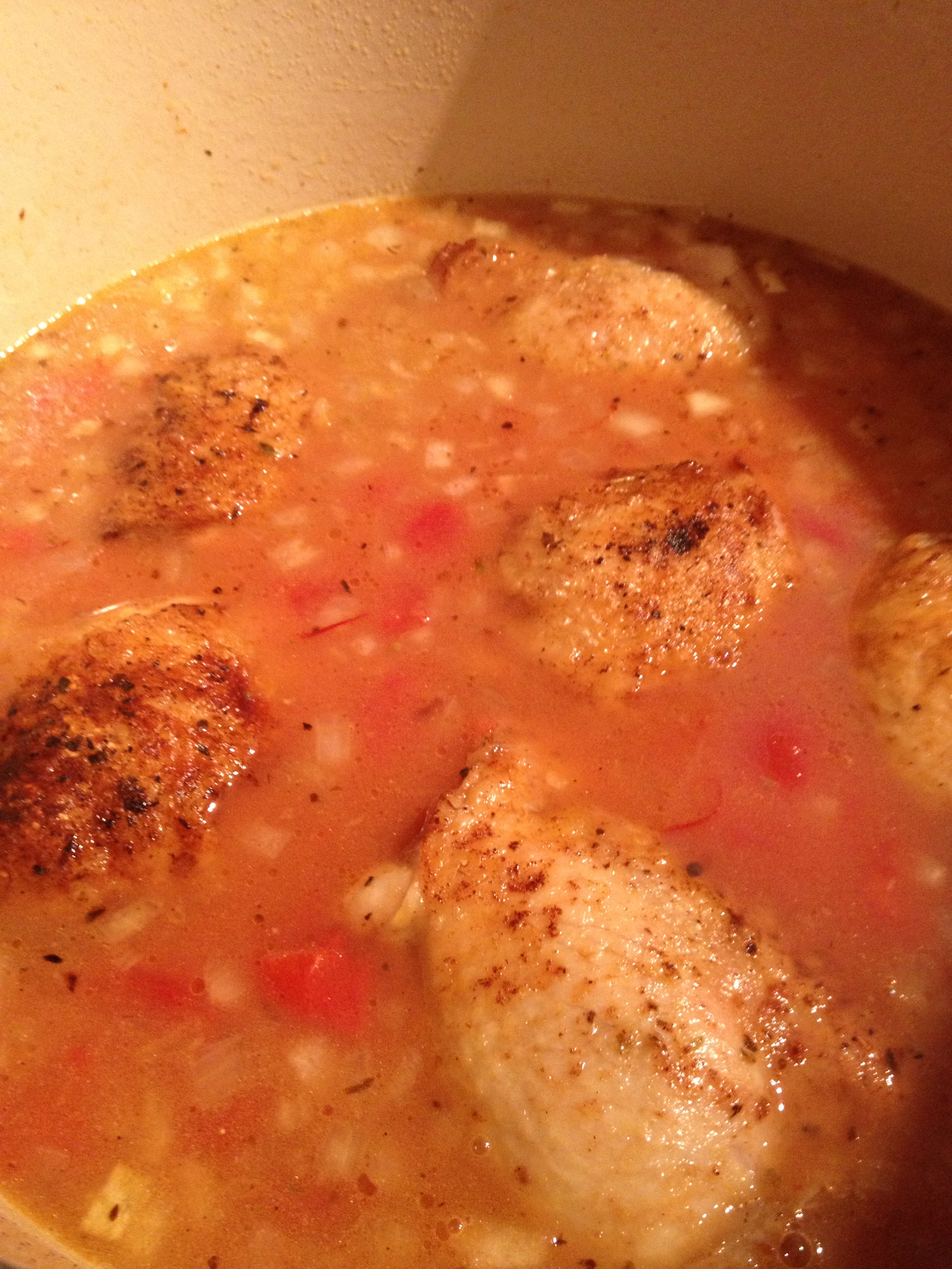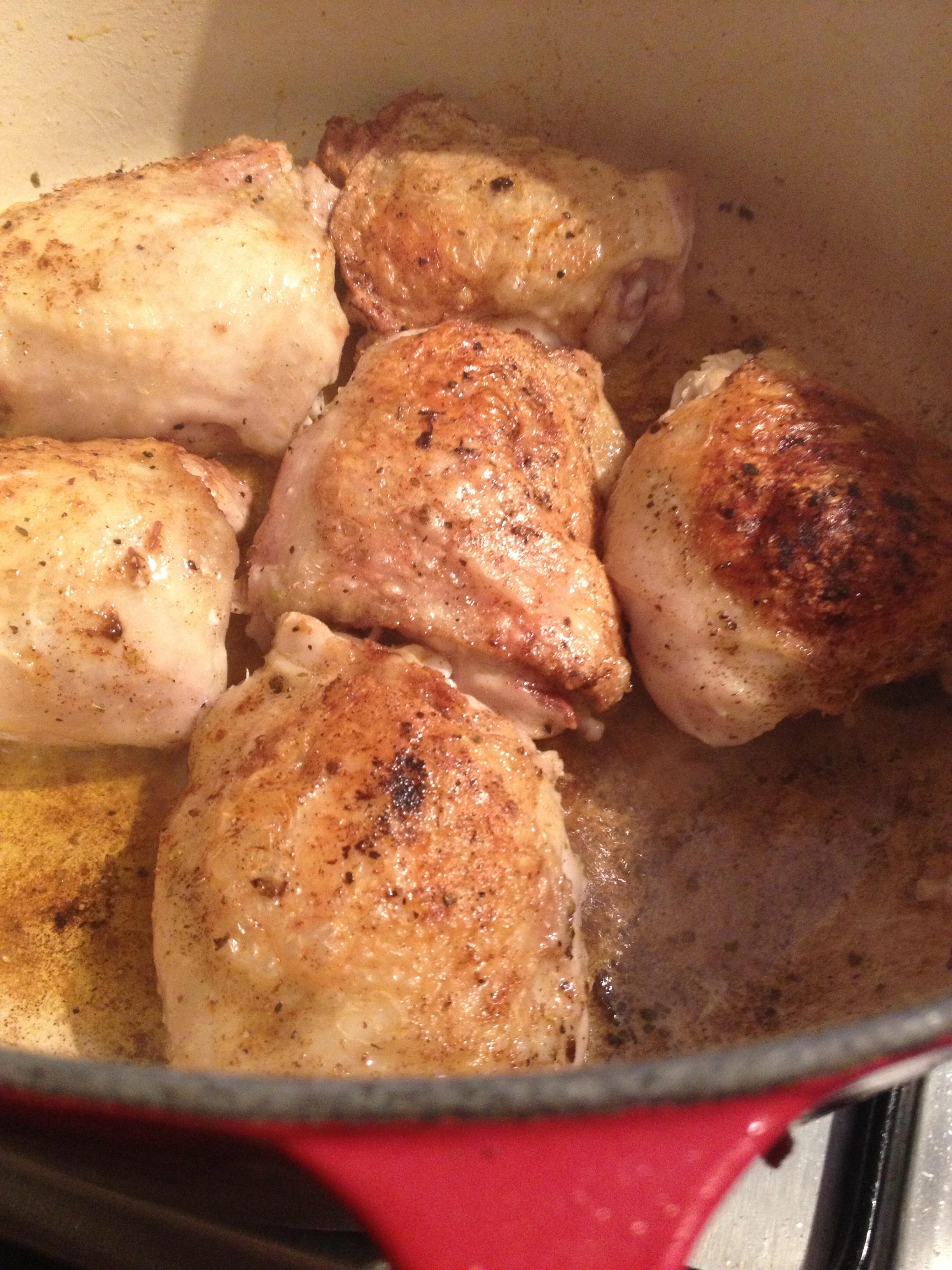 I season the chicken thighs with oregano, smoked paprika, and salt & pepper. Then brown, skin-side first.