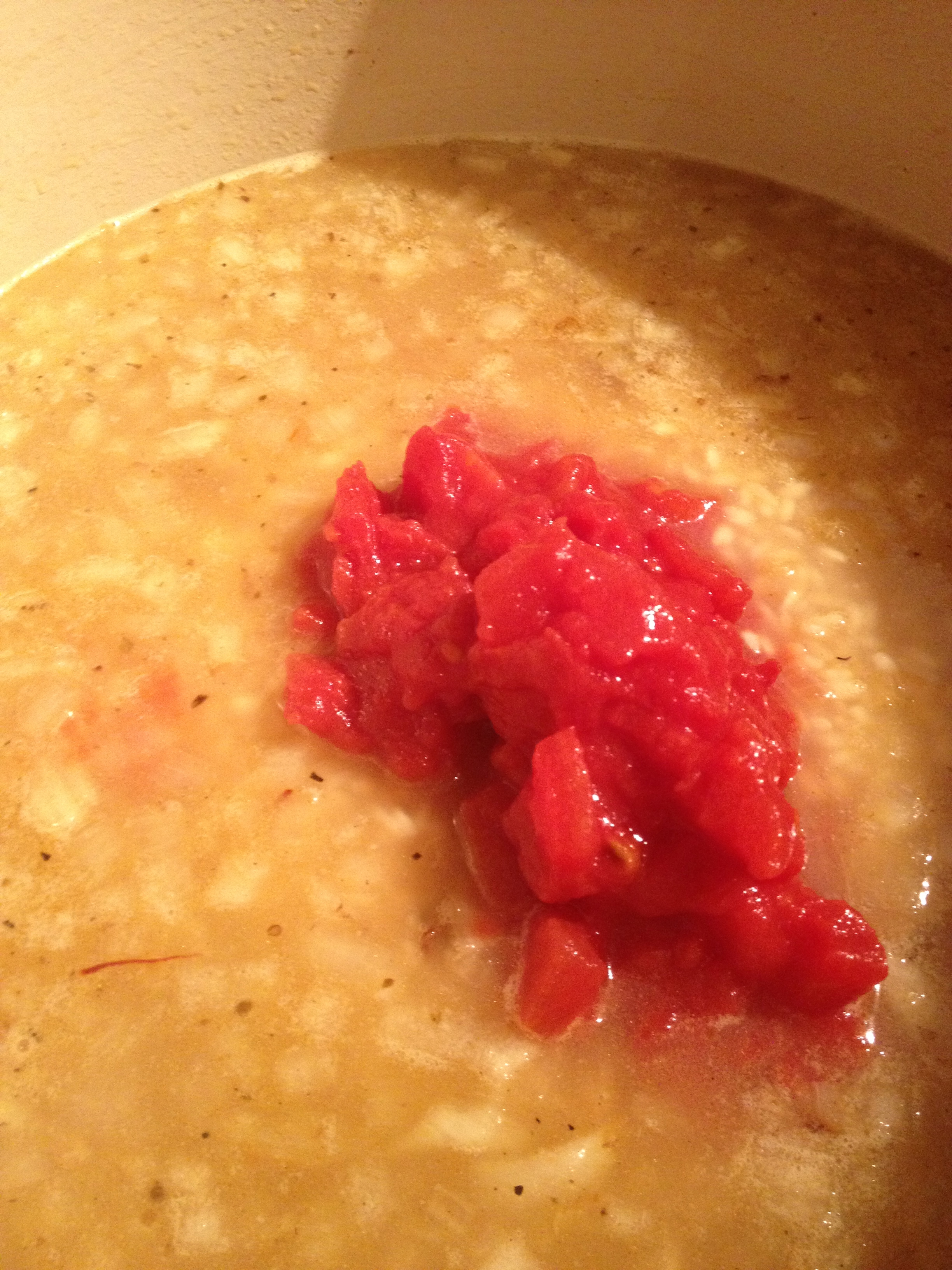 You will remove and reserve the chorizo, then the zucchini, then the chicken, adding it back once you have made the rice base. In the pan juices, I sauté onion and toast the rice. Then add chicken broth, tomatoes, and the magic paella ingredient: saffron.