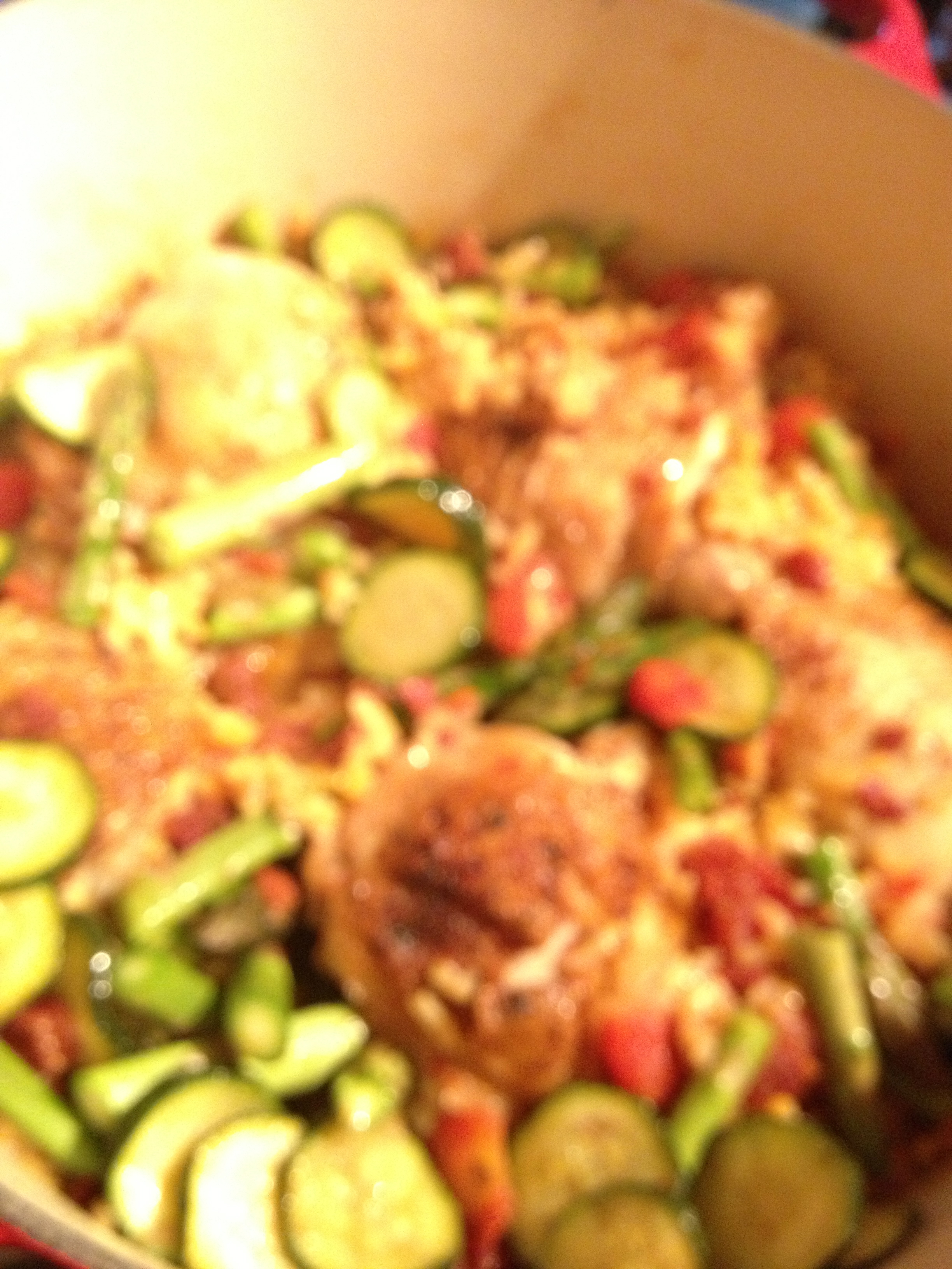 Add the asparagus and zucchini and heat in the oven for an additional 15 minutes with the lid on and 10-15 with the lid off.