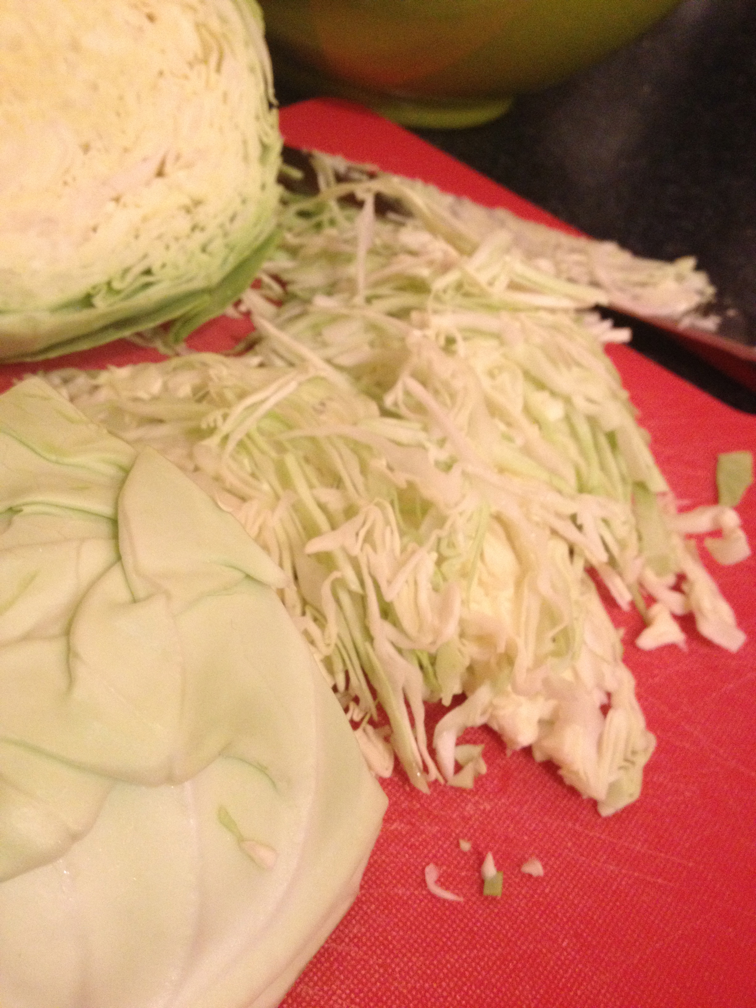 Since the cabbage is raw, I tried to very thinly slice it. The goal is to have it wilt ever so slightly when you add the warm bacon vinaigrette.