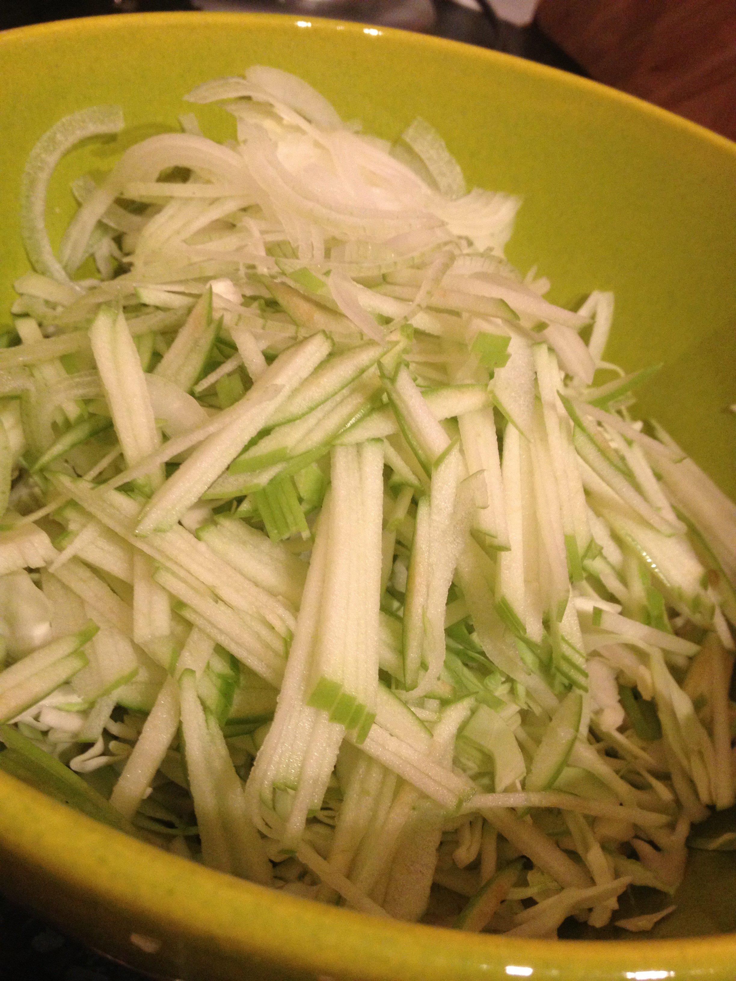 Add julienned apples. Personally, I like the sour bite of granny smiths. I also used very thinly sliced raw onions in the salad, but if you are someone who finds the raw bite of onion overwhelming, feel free to sauté or grill them for a few minutes to take the edge off.