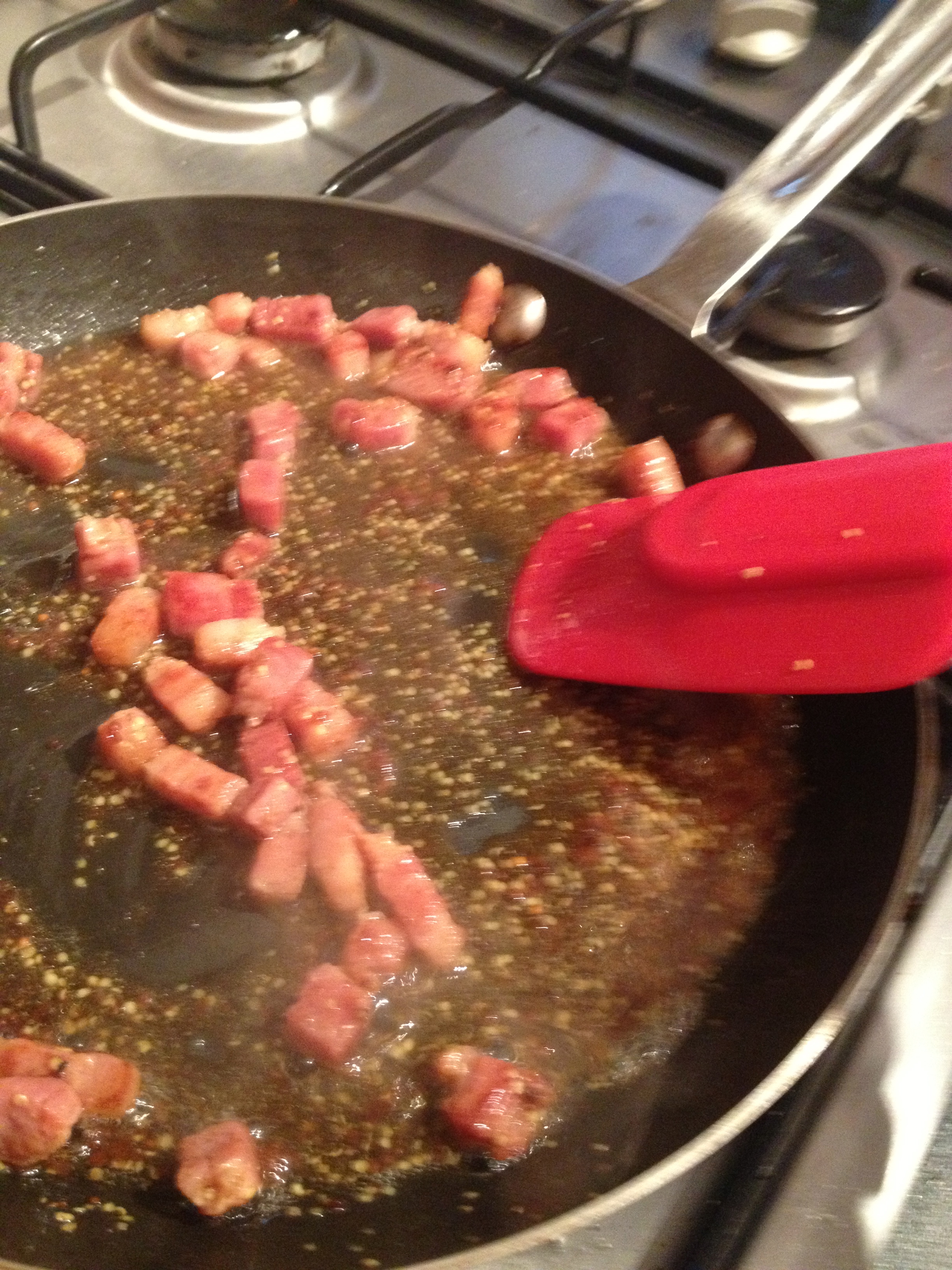 Right before you are ready to serve, make your warm bacon vinaigrette by crisping up bacon. Depending on how much fat cooks off, you may need to add a bit of olive oil or drain off some bacon fat, until you have about 3 Tbs of fat in the pan. Then whisk with cider vinegar and wholegrain mustard.
