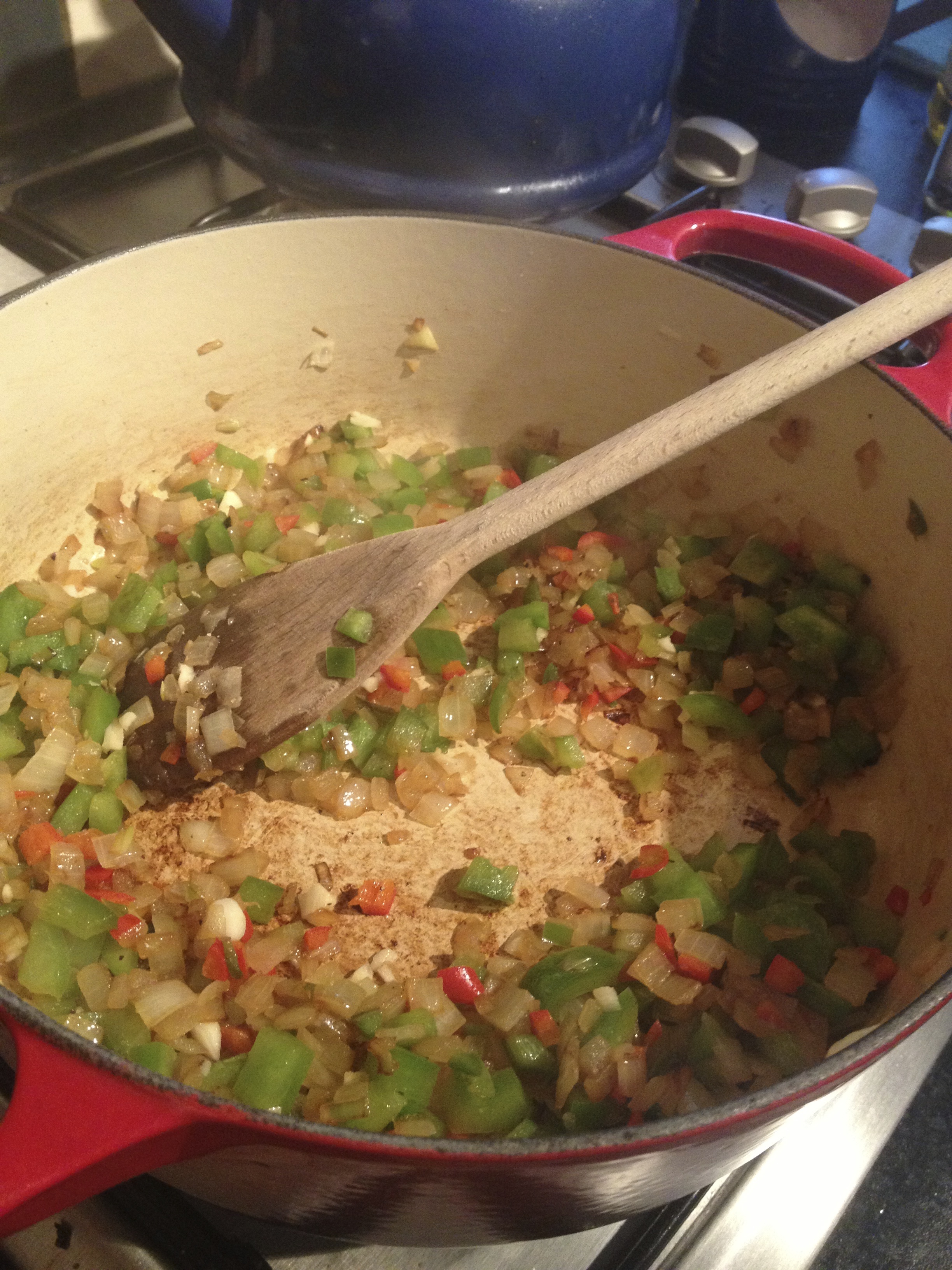 But hopefully you have remembered to start dinner at a reasonable hour because I don’t have any tricks up my sleeve to speed up this process for you. Start by sweating the vegetables: pepper, onion, garlic, and spicy jalapeno, to create a strong flavor base.