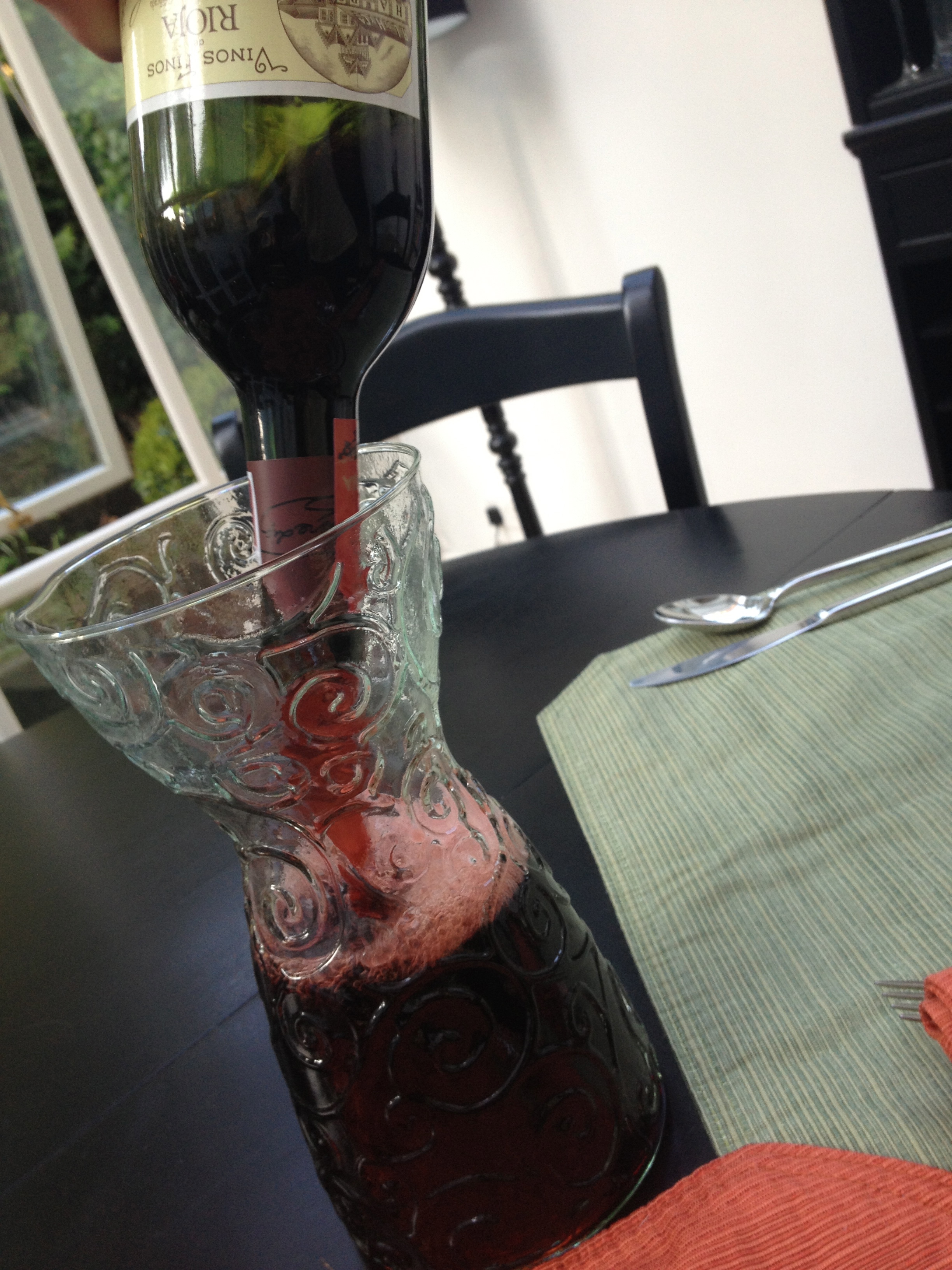 The guy at the shop noted that this red, a 2005 Vina Cubillo, would really open up if I had an hour or so to let it sit before dinner, so as soon as Gertie and I got home I did a quick decanting. This trick, if you are short on time, is to pour the bottle out really quickly. Basically just turn it straight upside-down into your pitcher or decanter. Nothing fancy here folks.