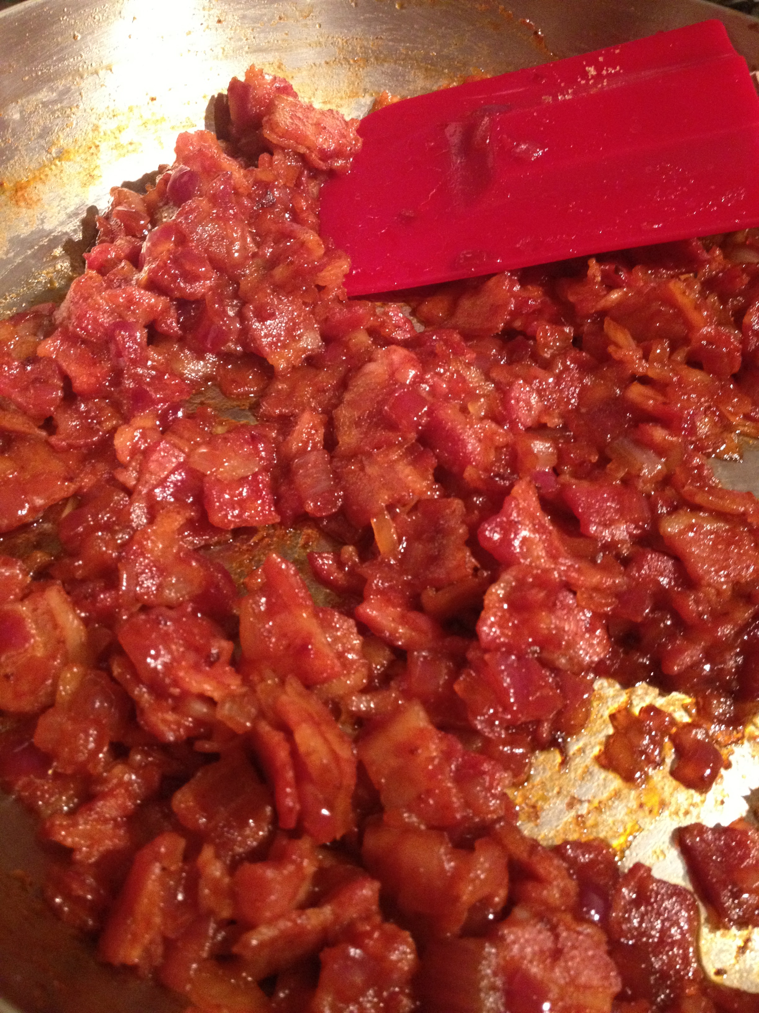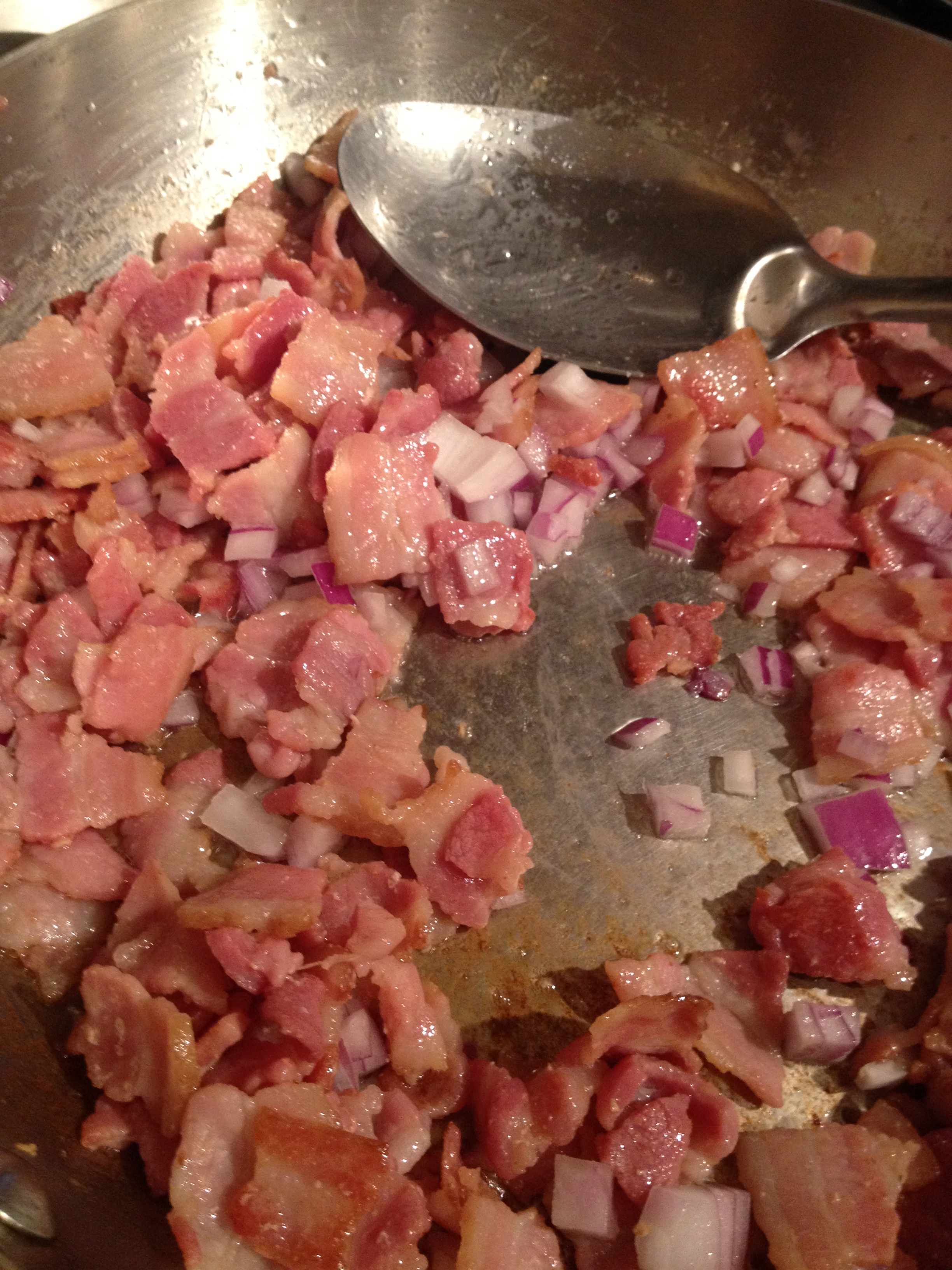 To start, I crisp up some of the bacon then add the rest so that the fats slowly cook out while caramelizing the onions.