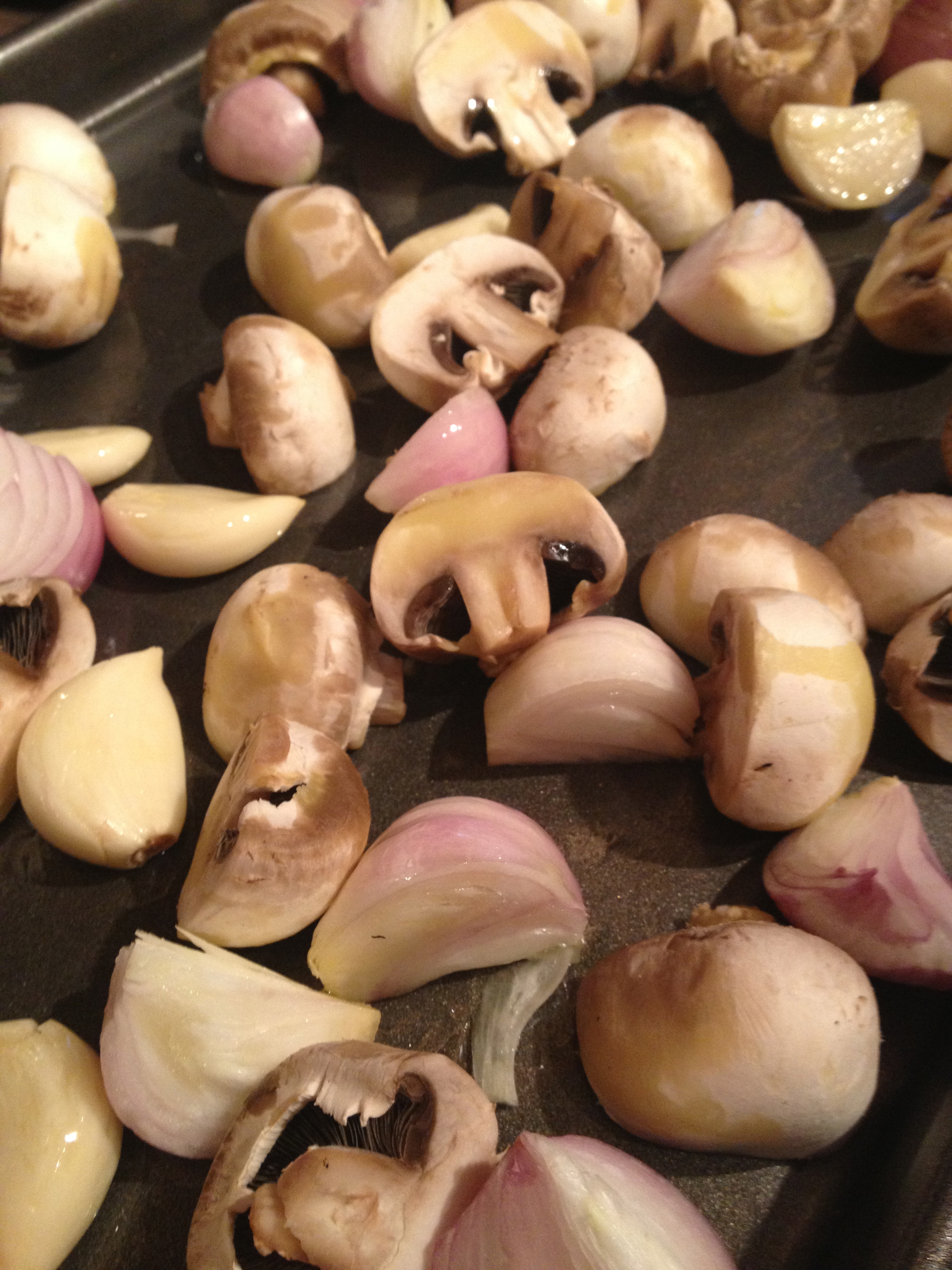 I roast the vegetables in stages so that they all get perfectly cooked. Start with the shallots and garlic, which need the longest time to get perfectly caramelized.
