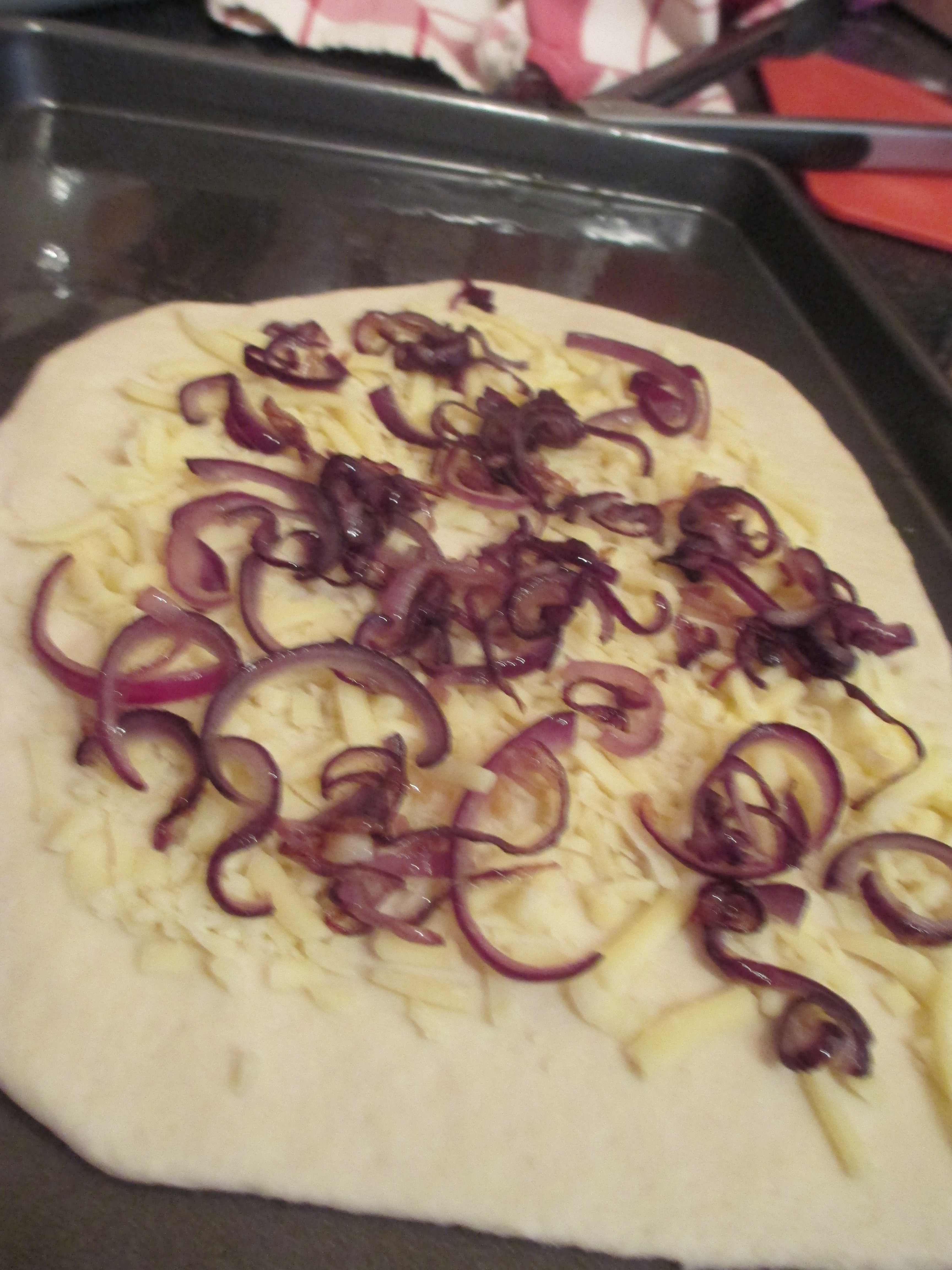 While the dough rises, caramelize the onions. Add 2 tsp olive oil to a small skillet and heat over low. Add the onions and cook, stirring frequently, until very soft, about 30 minutes.