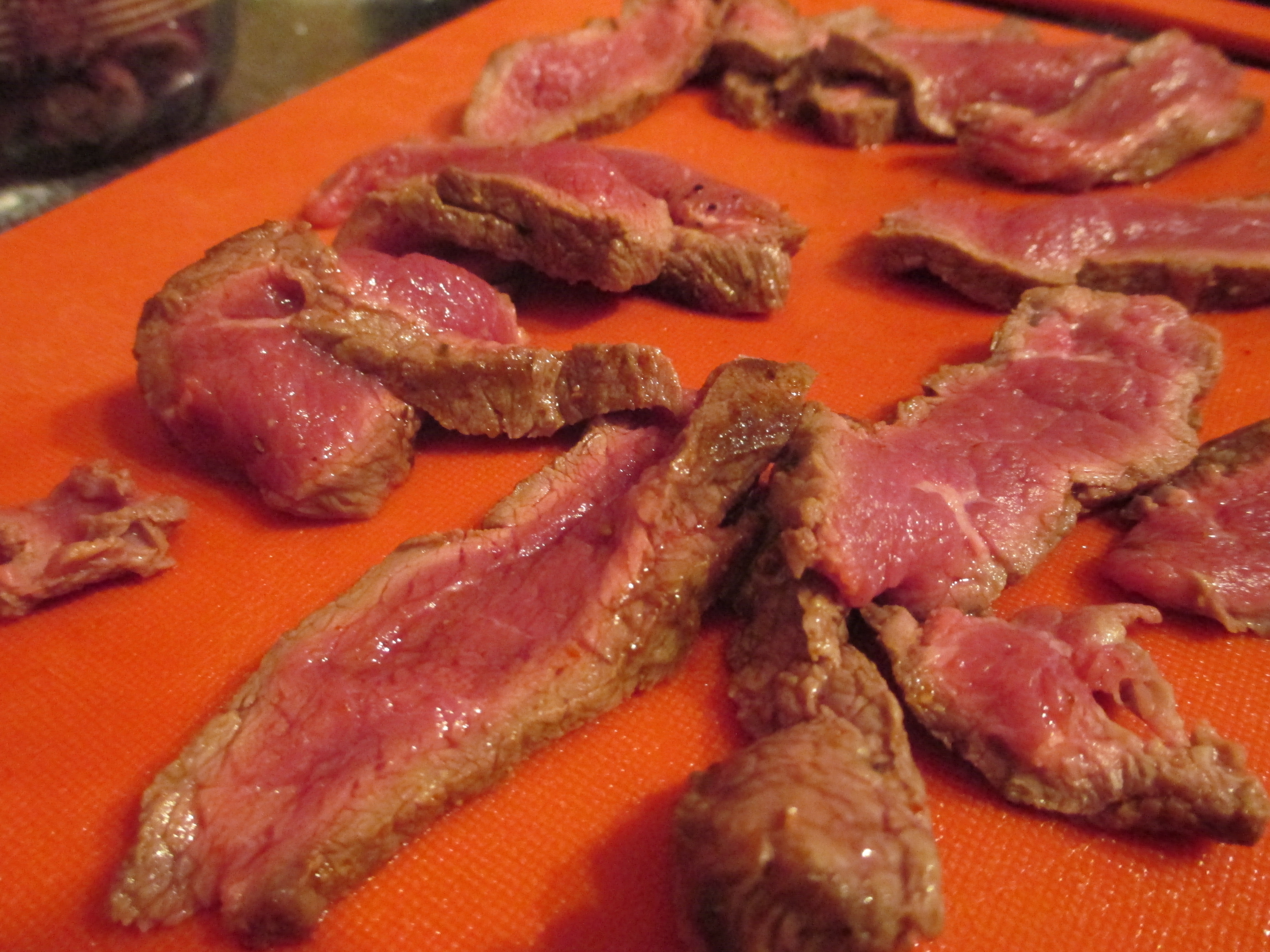 I realize that this recipe does not actually use burger meat, which I debated, but concluded that the flavor of the burger is there and the thin rare steak would hold up better on the pizza, as it cooks a bit more in the oven.