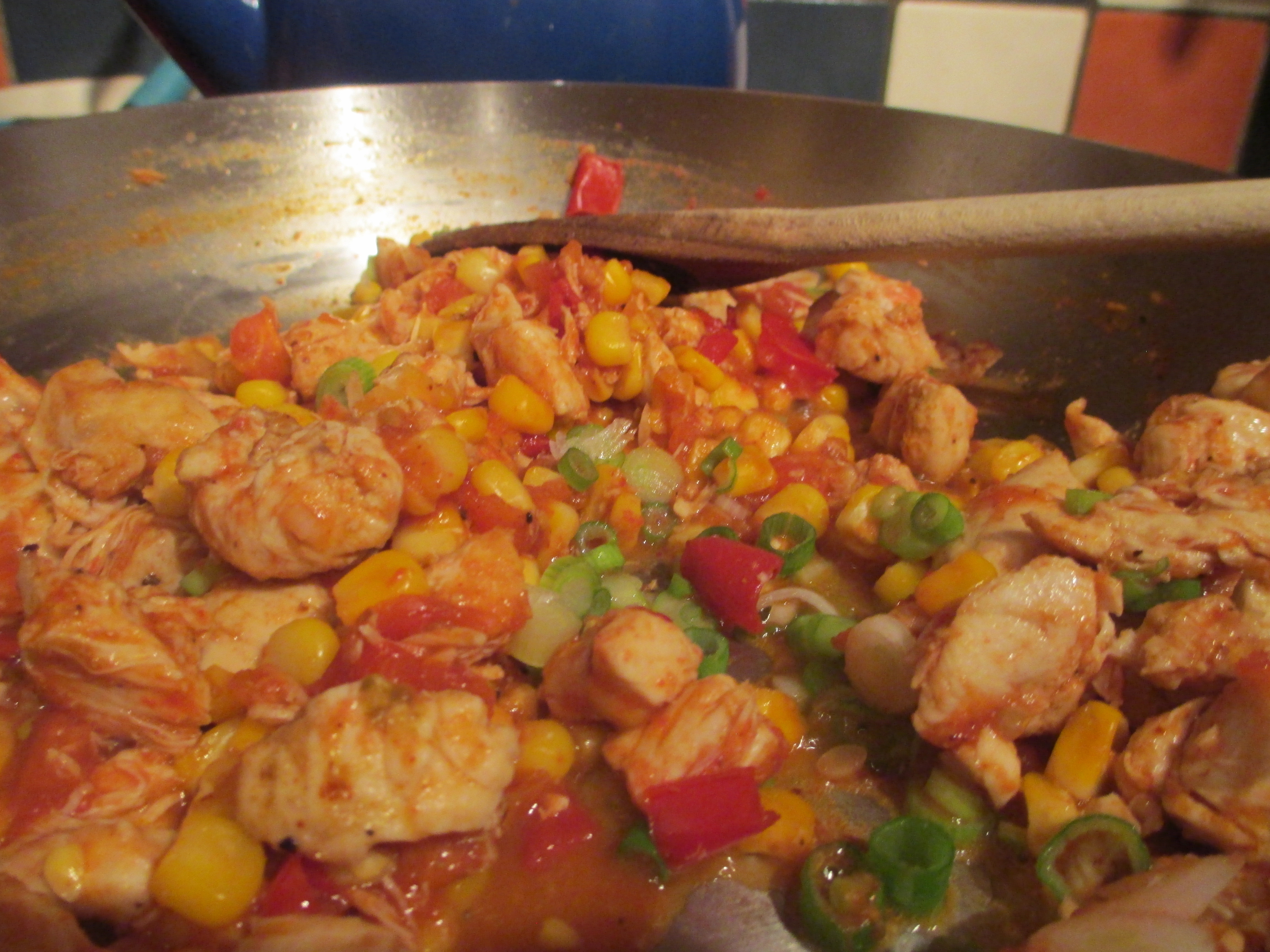Dice the chicken into bite-size pieces. Heat the olive oil in a large skillet over medium heat. Season the chicken with cumin, coriander, chili powder, salt and pepper. Cook for 4 minutes before stirring. Then once the chicken begins to brown, stir and continue to cook fro 3 more minutes. Then deglaze the pan with the tequila and lime juice. Drizzle with honey and mix. Add the corn and tomatoes and cook for an additional 3-5 minutes until heated through.Turn off the heat and stir in the scallions.