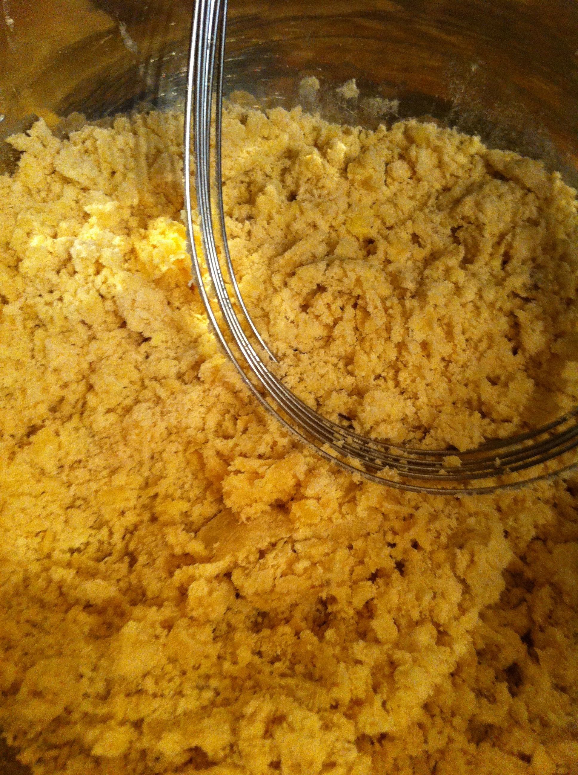 To make them, cut cold butter into the flour along with a mashed banana. It will become a bit grainy once it is fully mixed.