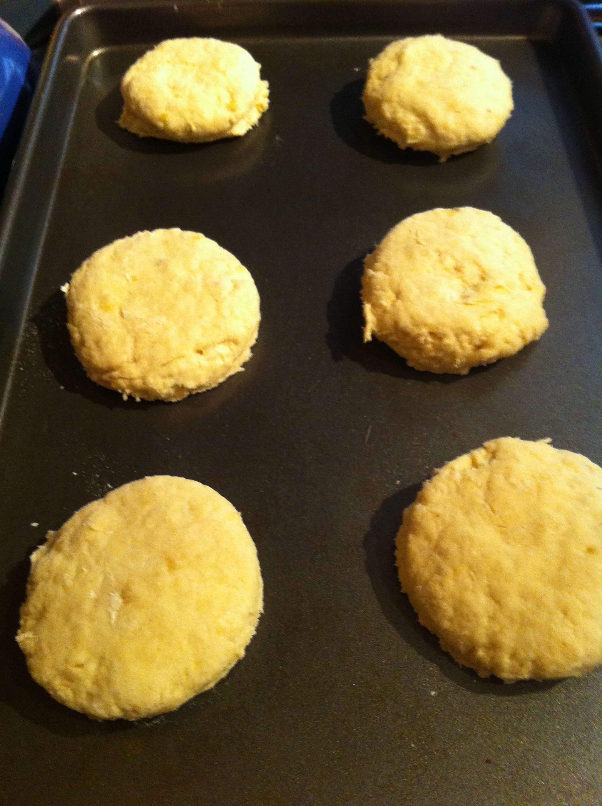 On a floured surface, roll out to 1 inch thick. Using a biscuit cutter or glass, cut into 3 inch rounds and place on an ungreased baking sheet. Chill in the refrigerator for 10 minutes. Remove from fridge and bake immediately for 12 minutes.