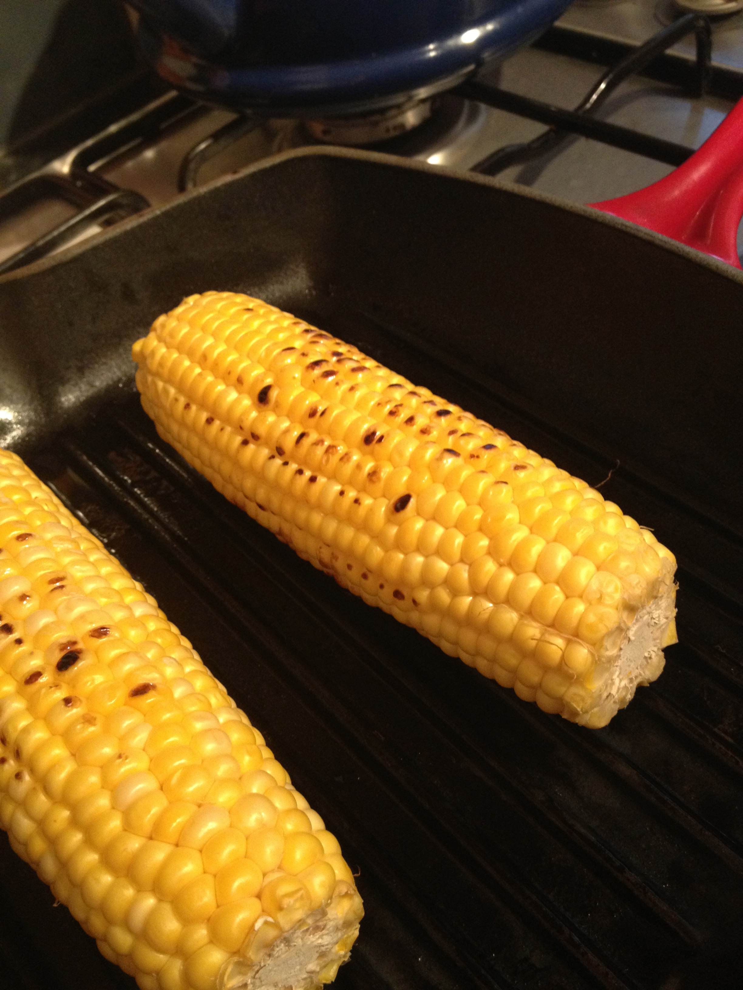 Heat a grill to medium. Remove husks and silks from the corn. Grill until the corn is evenly lightly charred, rotating frequently. This will take about 7 minutes on an open flame but may be longer on a grill pan. Slice the corn kernels off the cob and reserve.