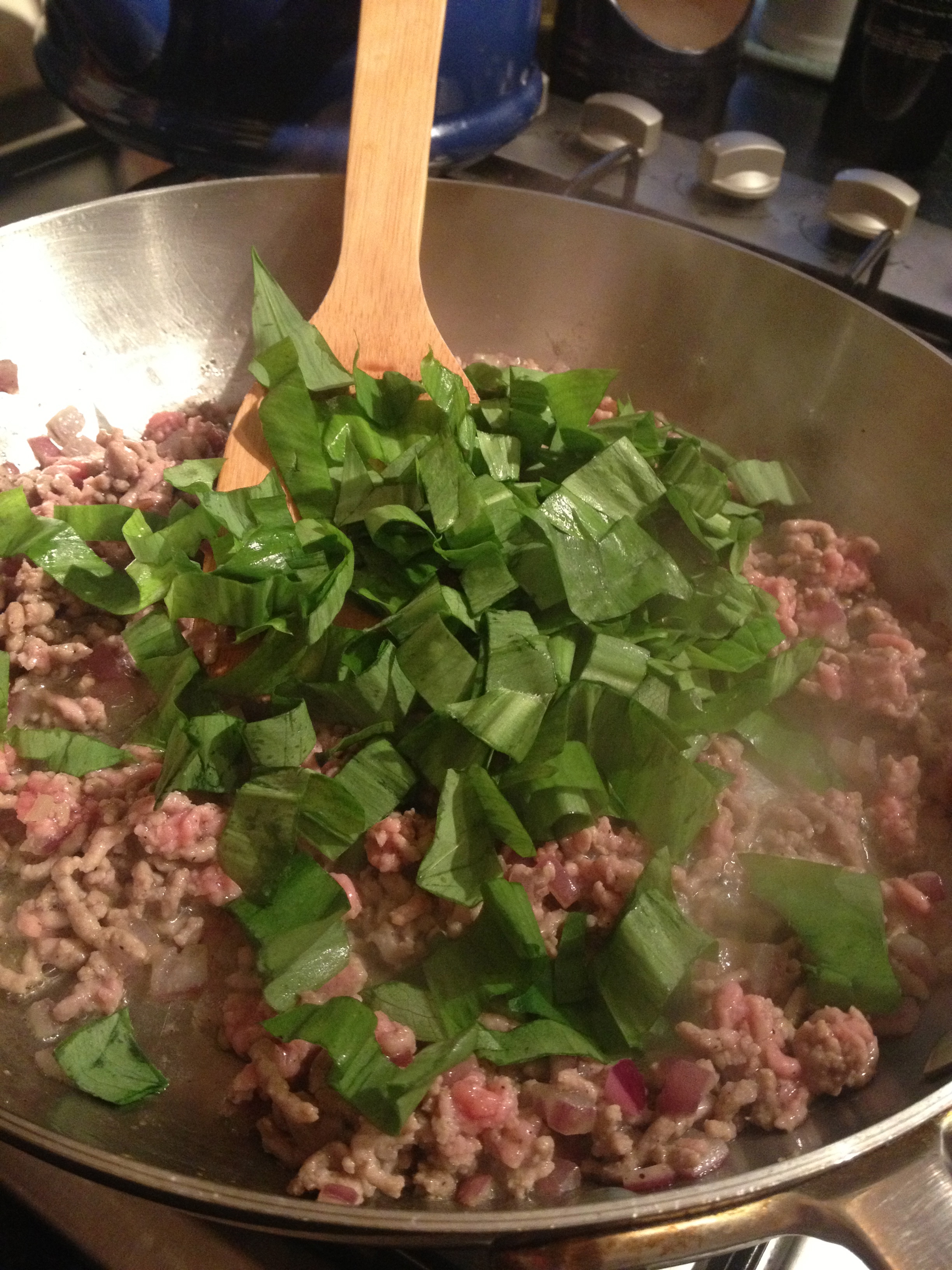 Add red onion and olive oil to a skillet and sauté over medium heat for 5 minutes, until soft. Add the ground lamb, crumbling as it cooks for 3-5 minutes, until browned. Season with Greek seasoning. Stir in the wild garlic (or spinach and garlic) and wilt slightly. Then deglaze the pan with balsamic vinegar and reduce for 1 minute. Turn off heat and set aside.