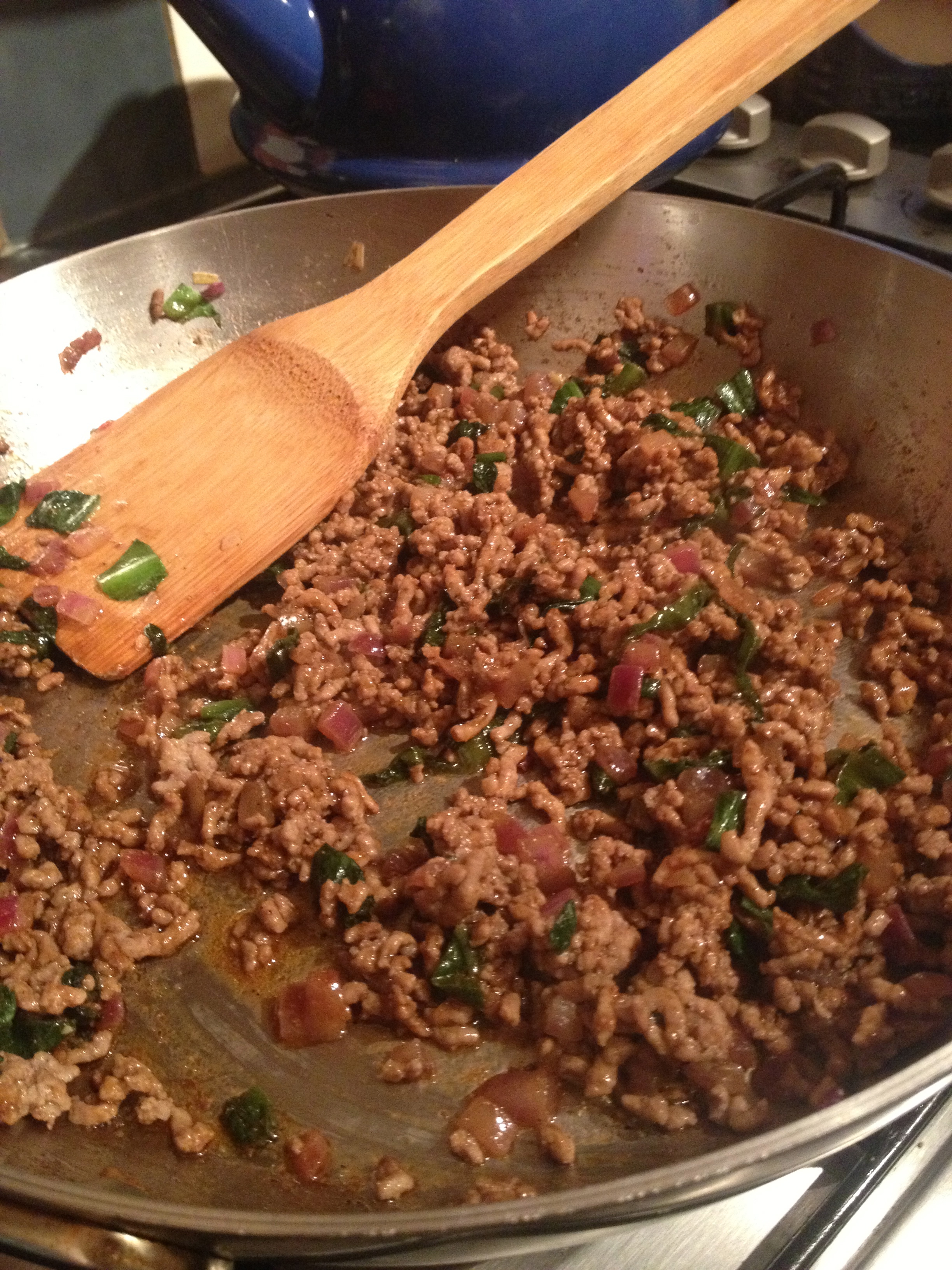 Once everything is cooked together, add a splash of balsamic vinegar to deglaze the pan and get up any yummy, lamby brown bits. Once the balsamic reduces a bit it will add a sweet, zippy bite to the topping.