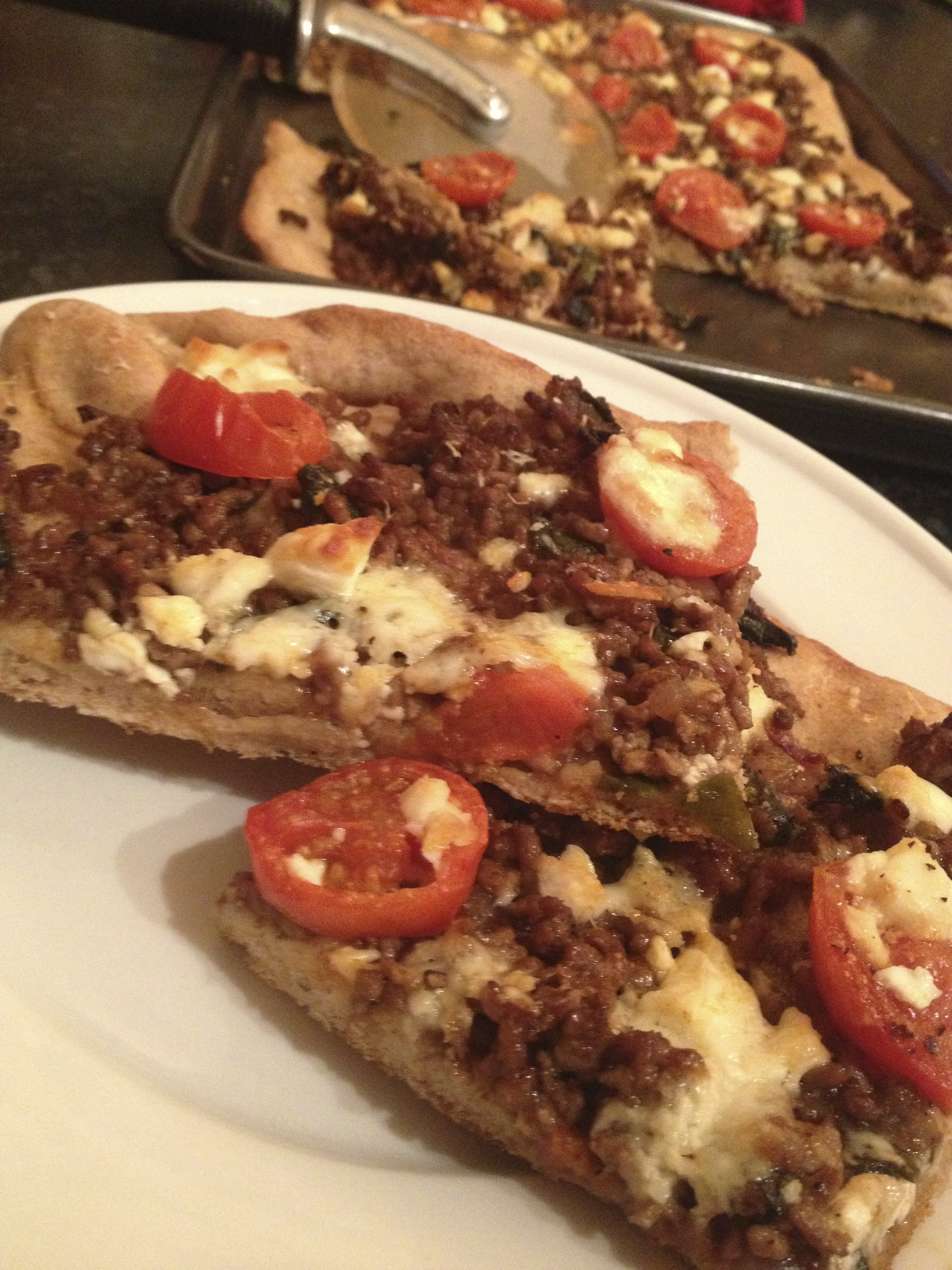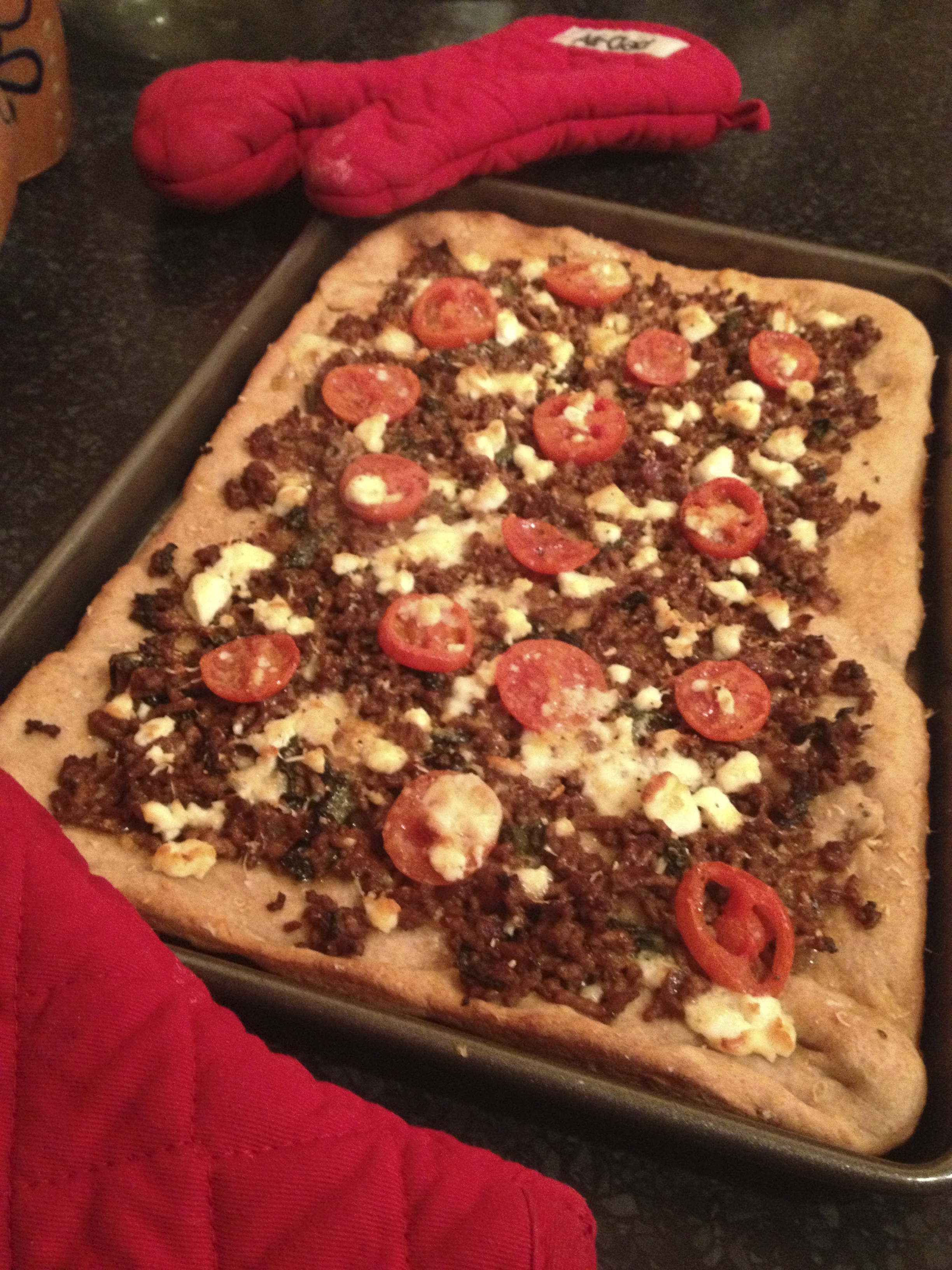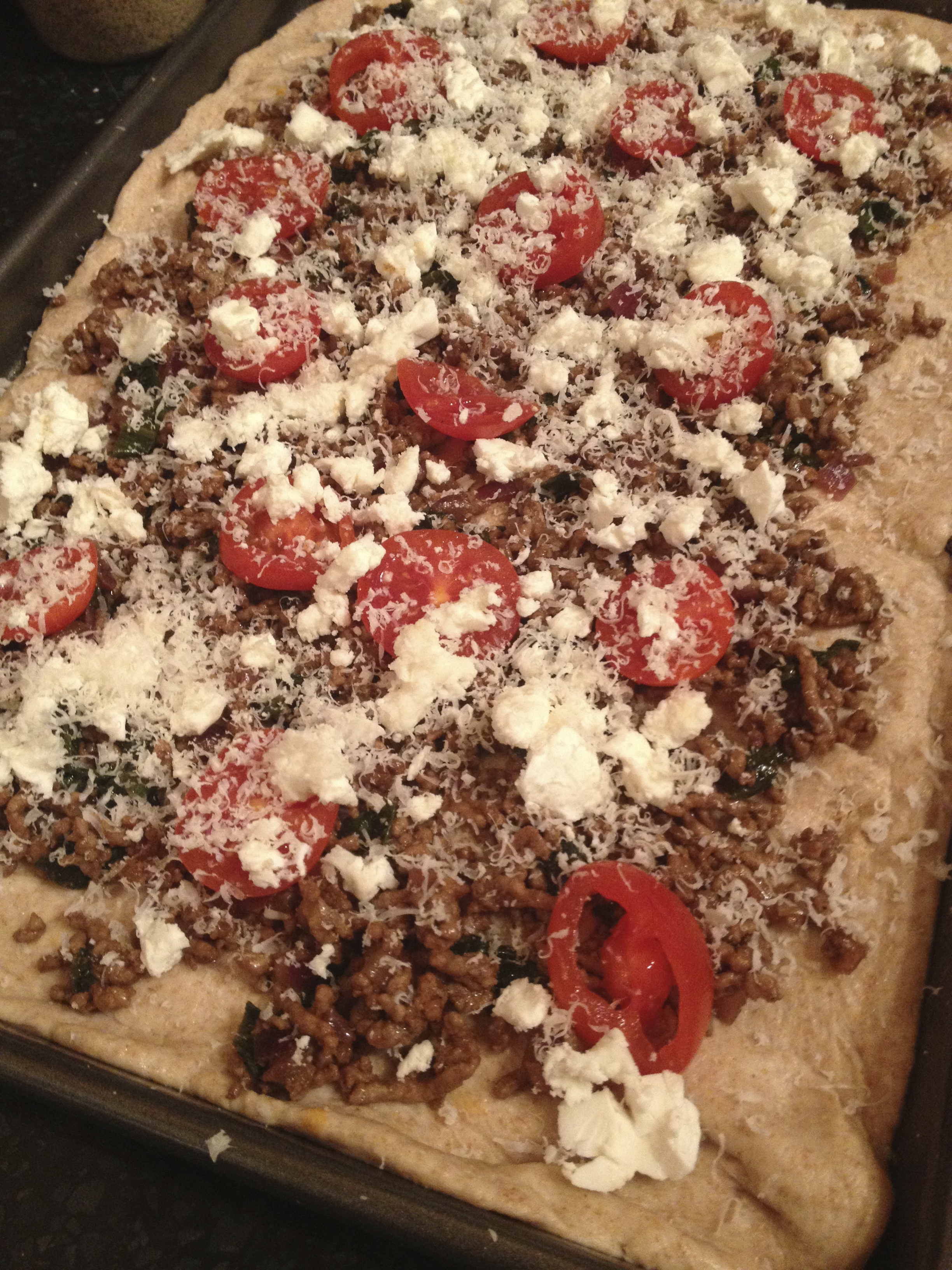 Spread the lamb topping out evenly over your bread dough. Then top with fresh slices of tomato, some salty crumbled feta cheese, and a happy, heavy coating of grated parmesan.