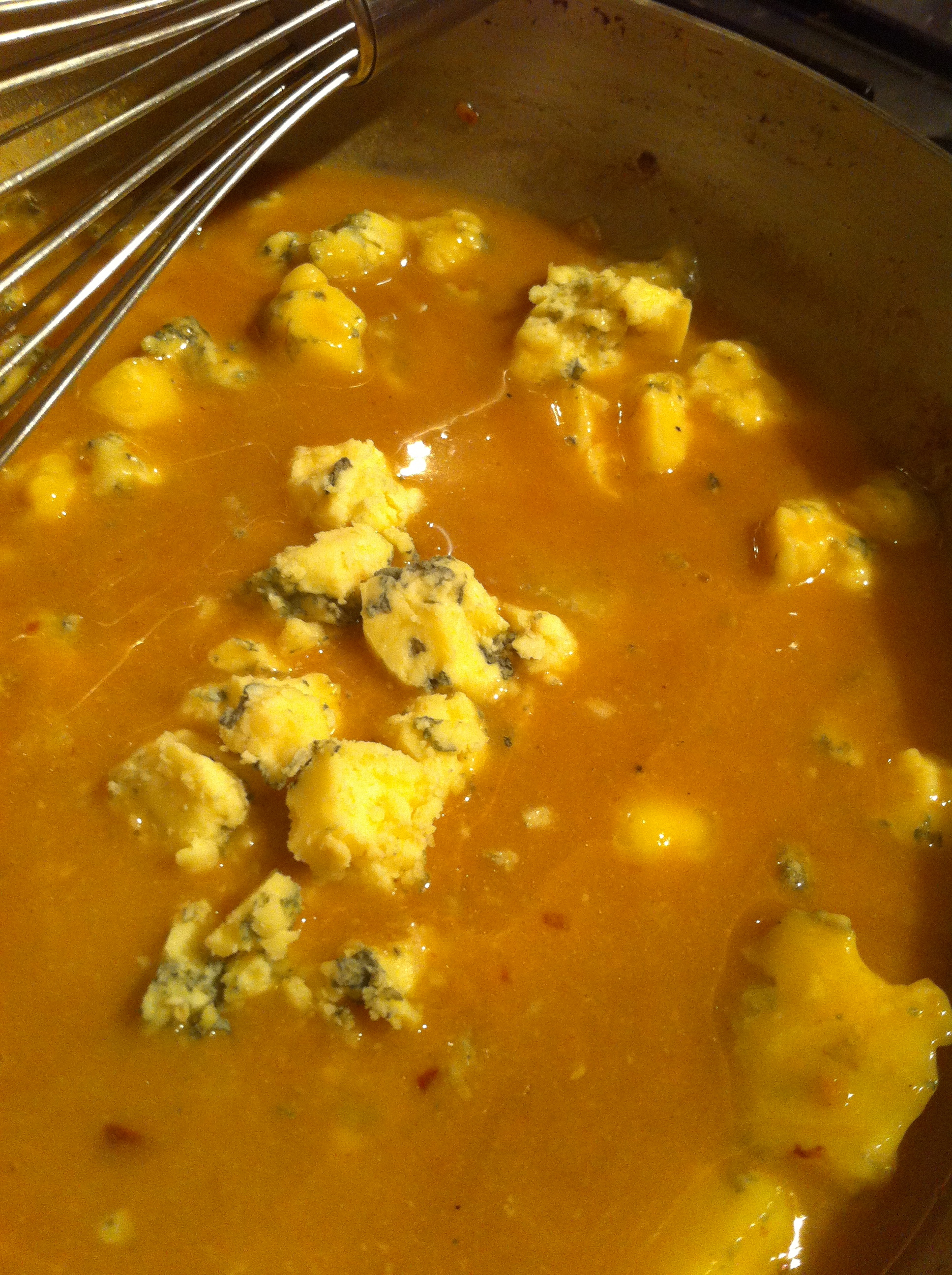 Turn the heat to low before mixing in the blue cheese. It may not all melt at once but will once you add the hot pasta.