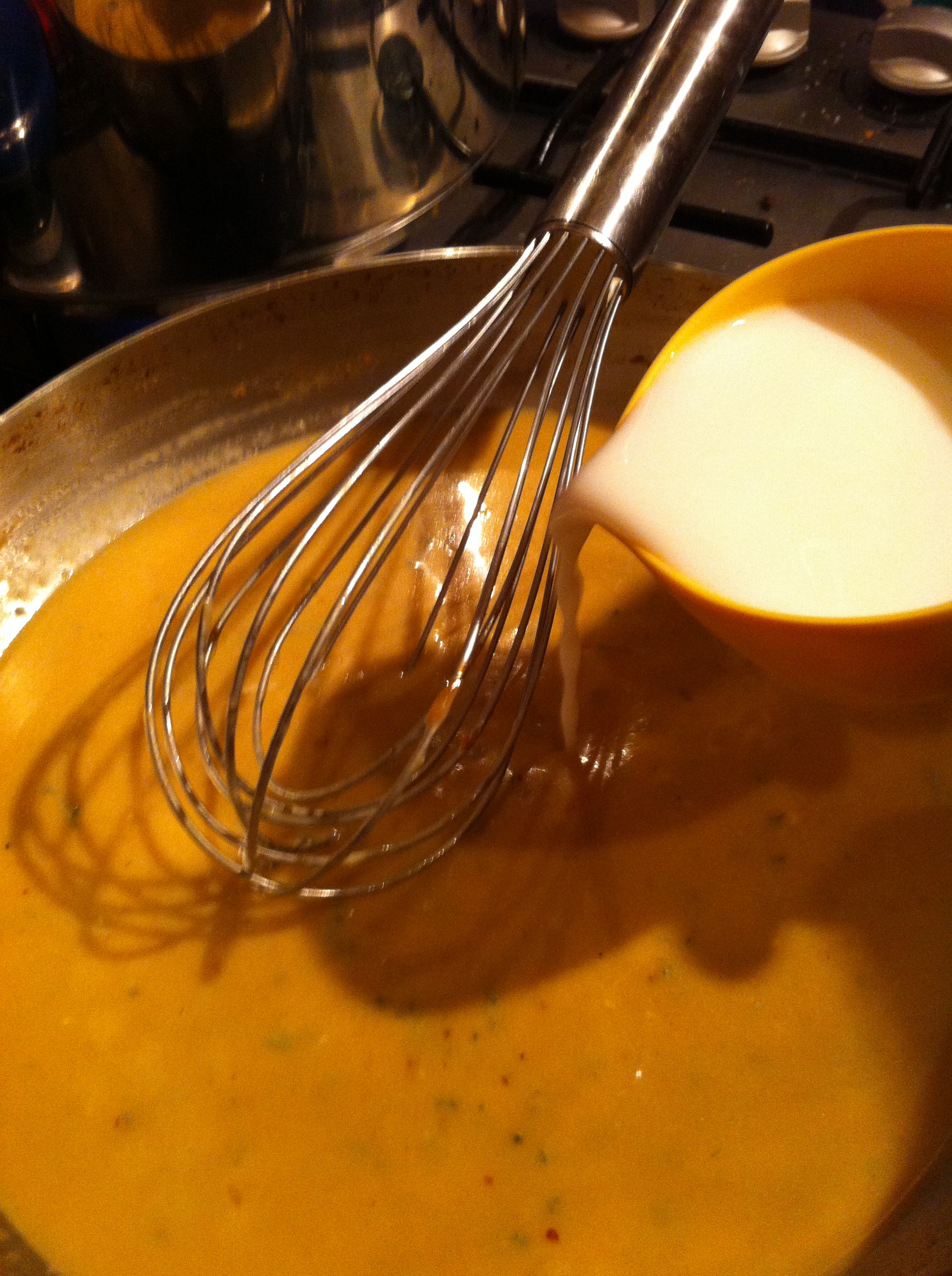 To make the base of this sauce, I add a bit of chicken soup starter and mustard to shallots and garlic. Then using the starchy pasta water and a bit of added flour to thicken it slightly.