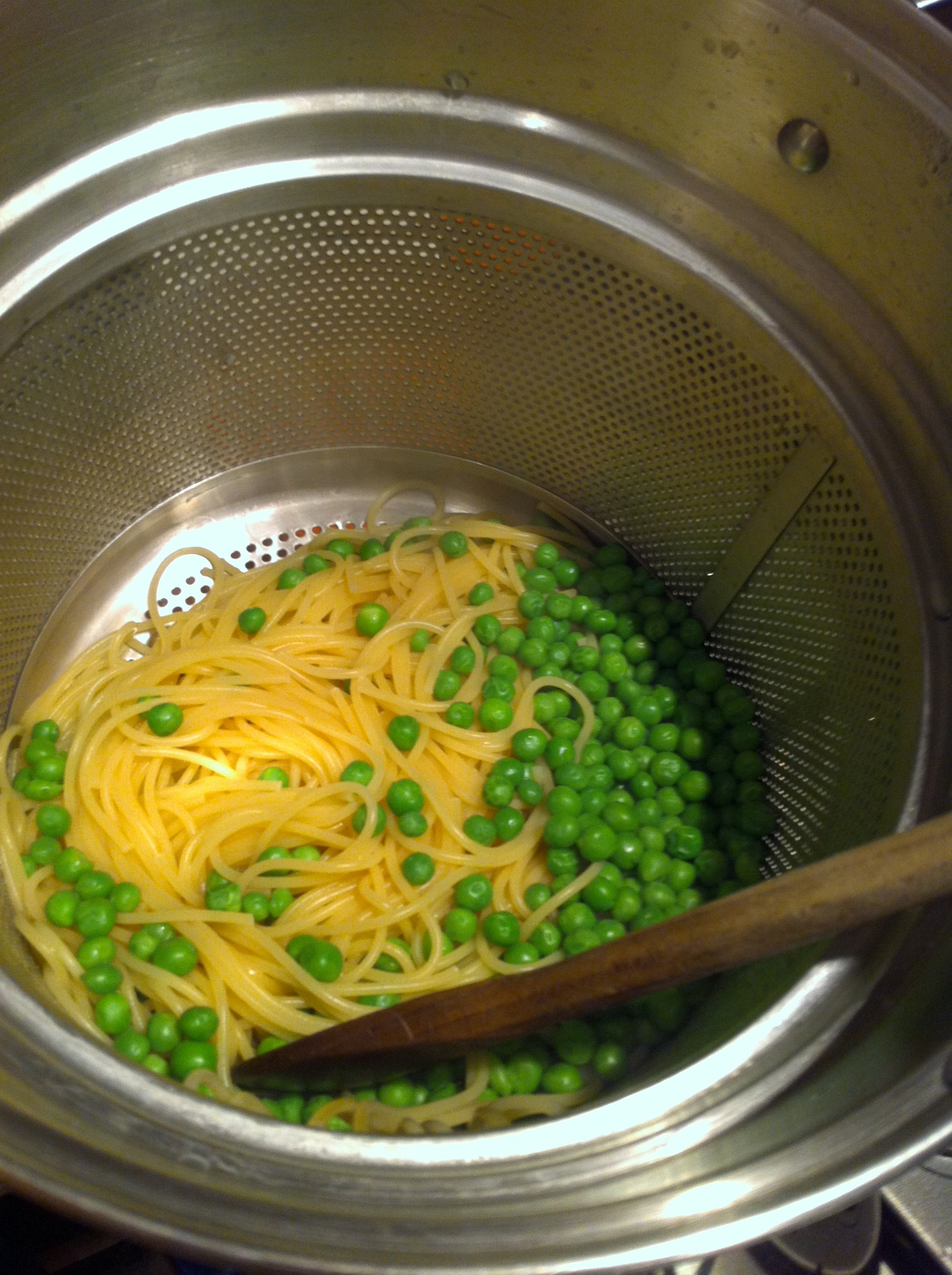 One of the tricks is to add the frozen peas directly to the boiling pasta in the last 2 minutes.