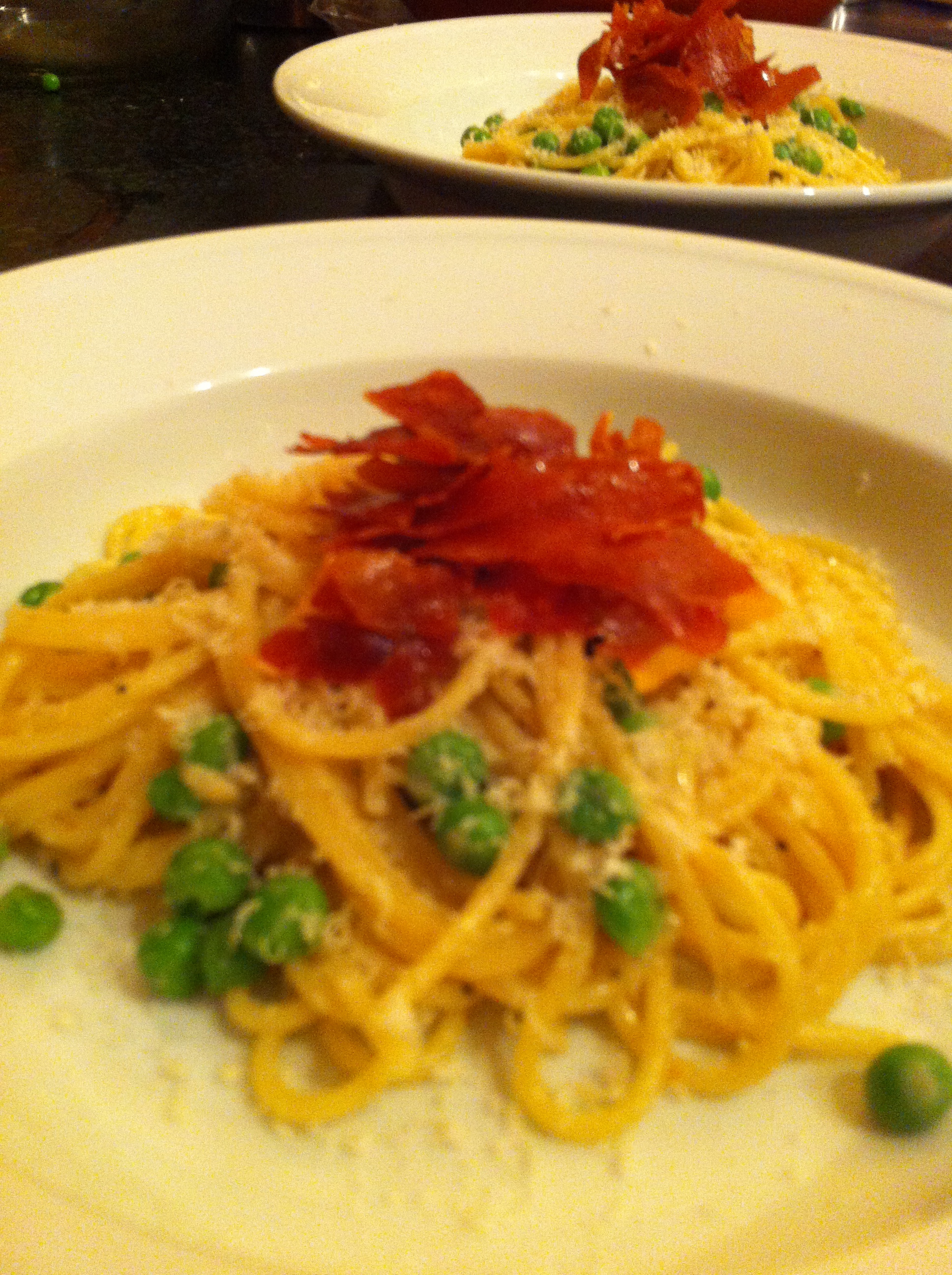 Once the sauce has begun to come together, toss with the pasta, peas, and parmesan (reserving 1/4 cup to sprinkle on top). If the sauce seems too thick, add a bit more pasta water to loosen. Divide into four pasta bowls and top with a tablespoon of parmesan and a crumbled strip of prosciutto.