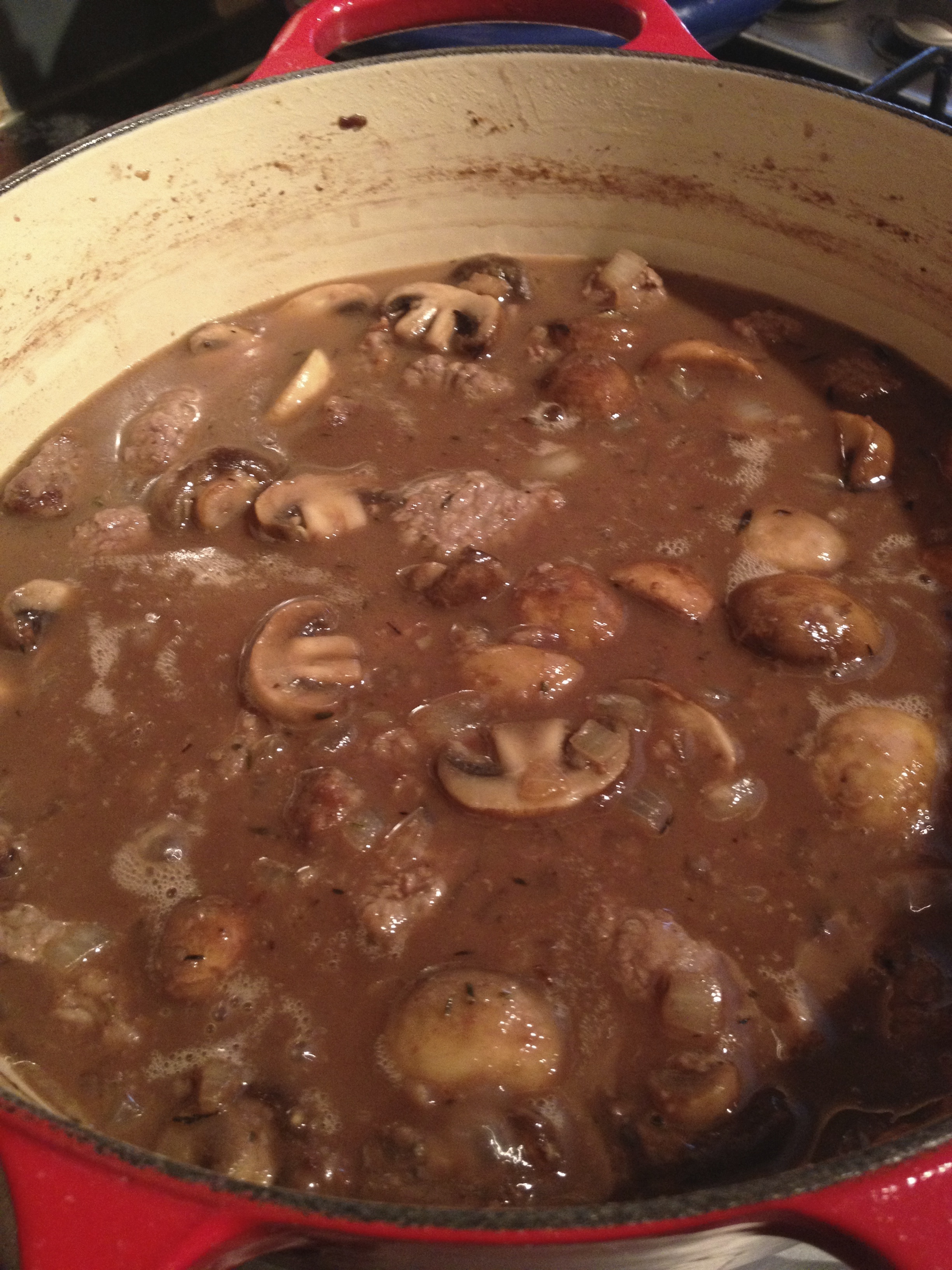 Brown the beef first, followed by mushrooms and onions. After adding a splash of port and some beef broth, you will slow cook the beef until it is incredibly tender. Don’t rush this step. Low and slow is the way to go.