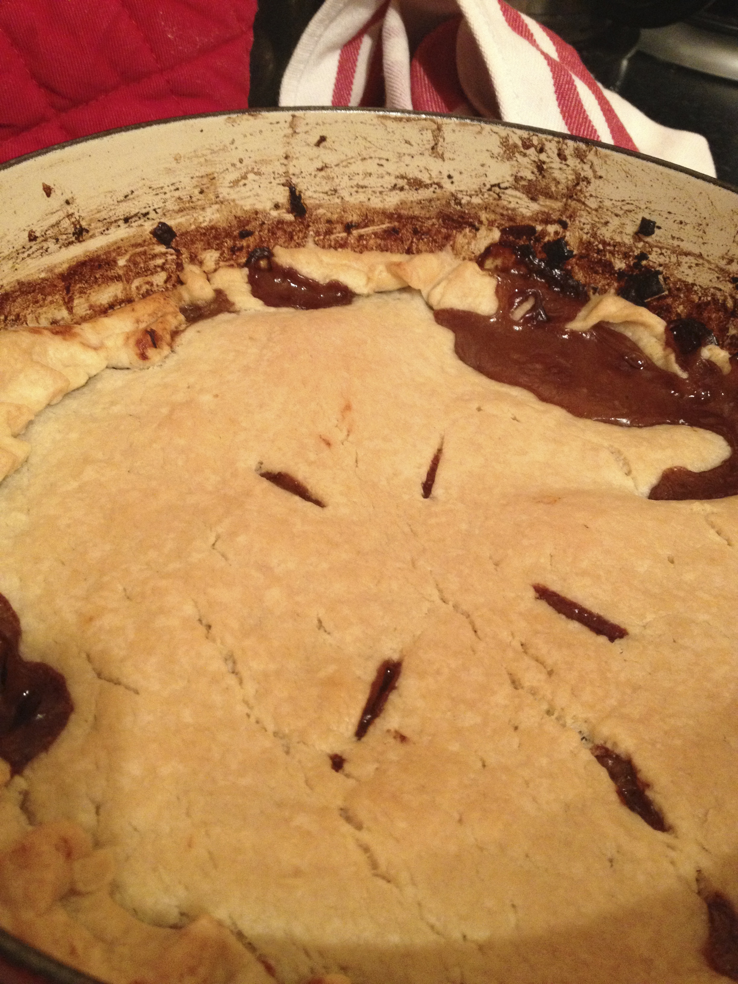 Once the beef is tender and your broth thickened, top with some crumbled stilton and a pie crust. (You could certainly do this in a separate baking dish, but I’m all about a one pot meal for less clean up.)