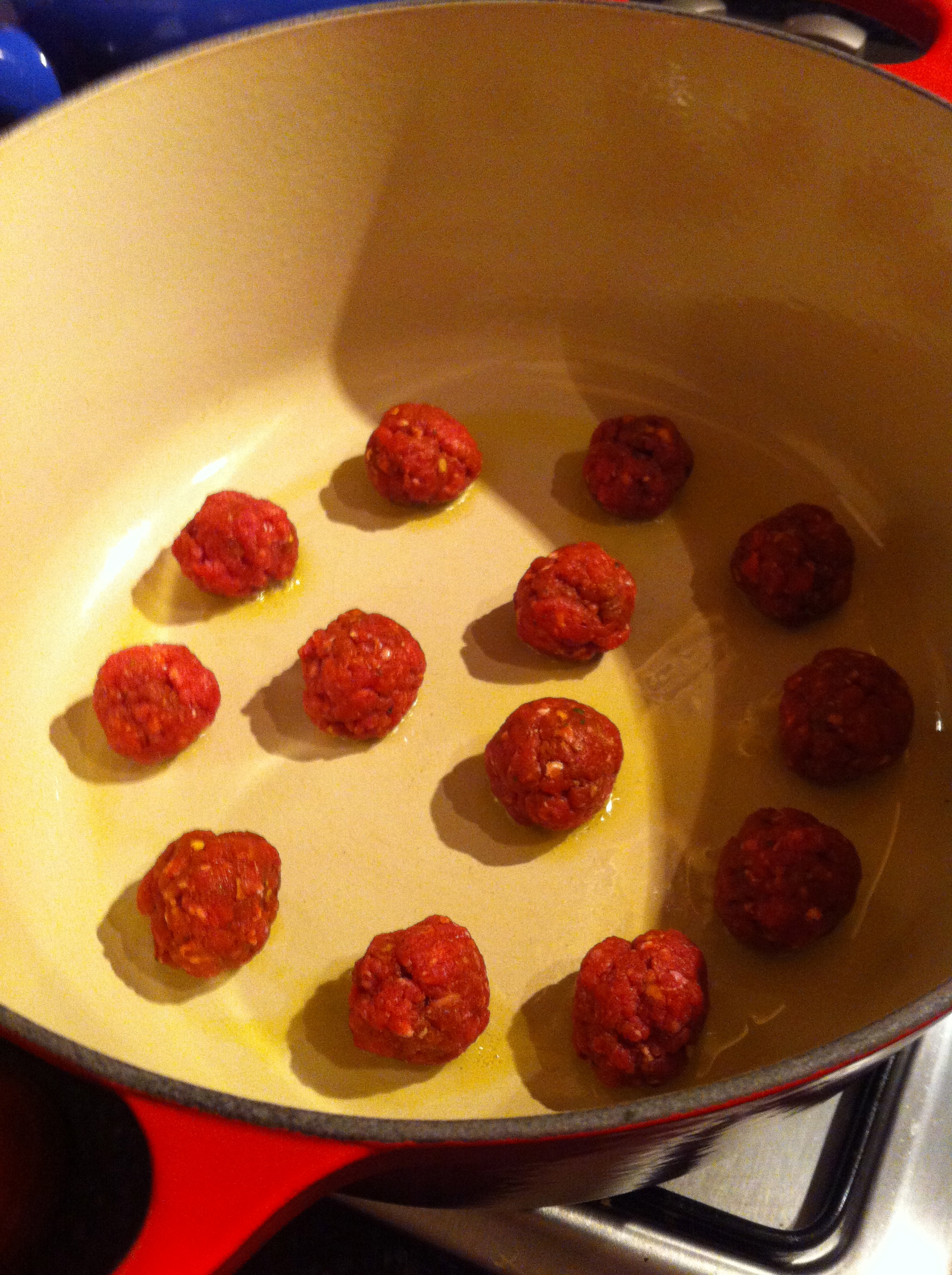 Heat a large soup pot with olive oil over medium heat. Brown the meatballs in two batches, about 1 minute per side. Remove and reserve.