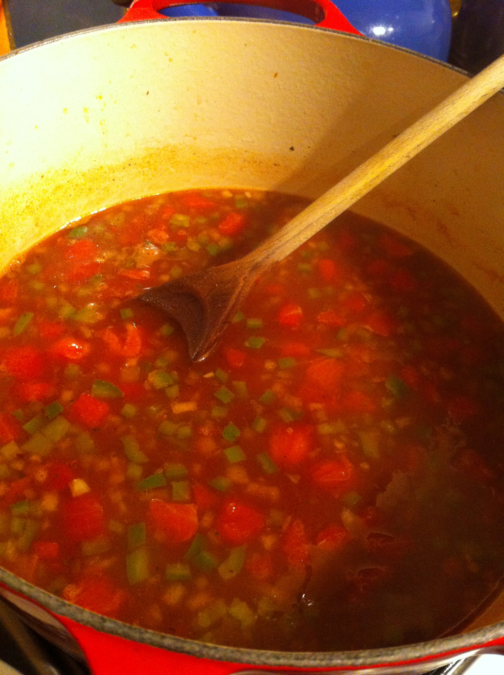 Make a classic chicken tortilla soup base with onions, peppers, and tomatoes. I use beef broth but you could certainly substitute chicken.