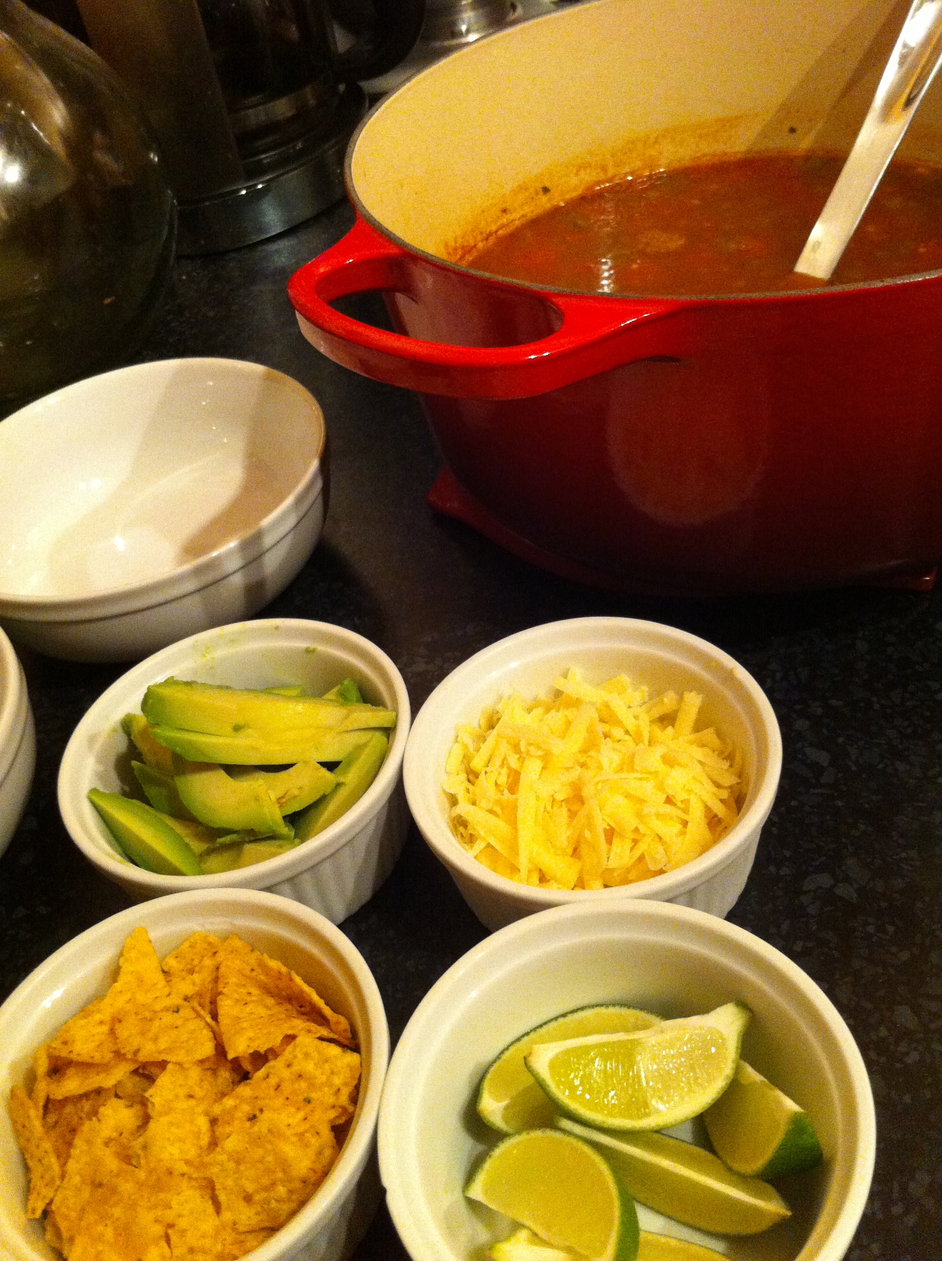 Serve the soup with crushed tortilla chips, shredded cheese, avocado slices and lime.