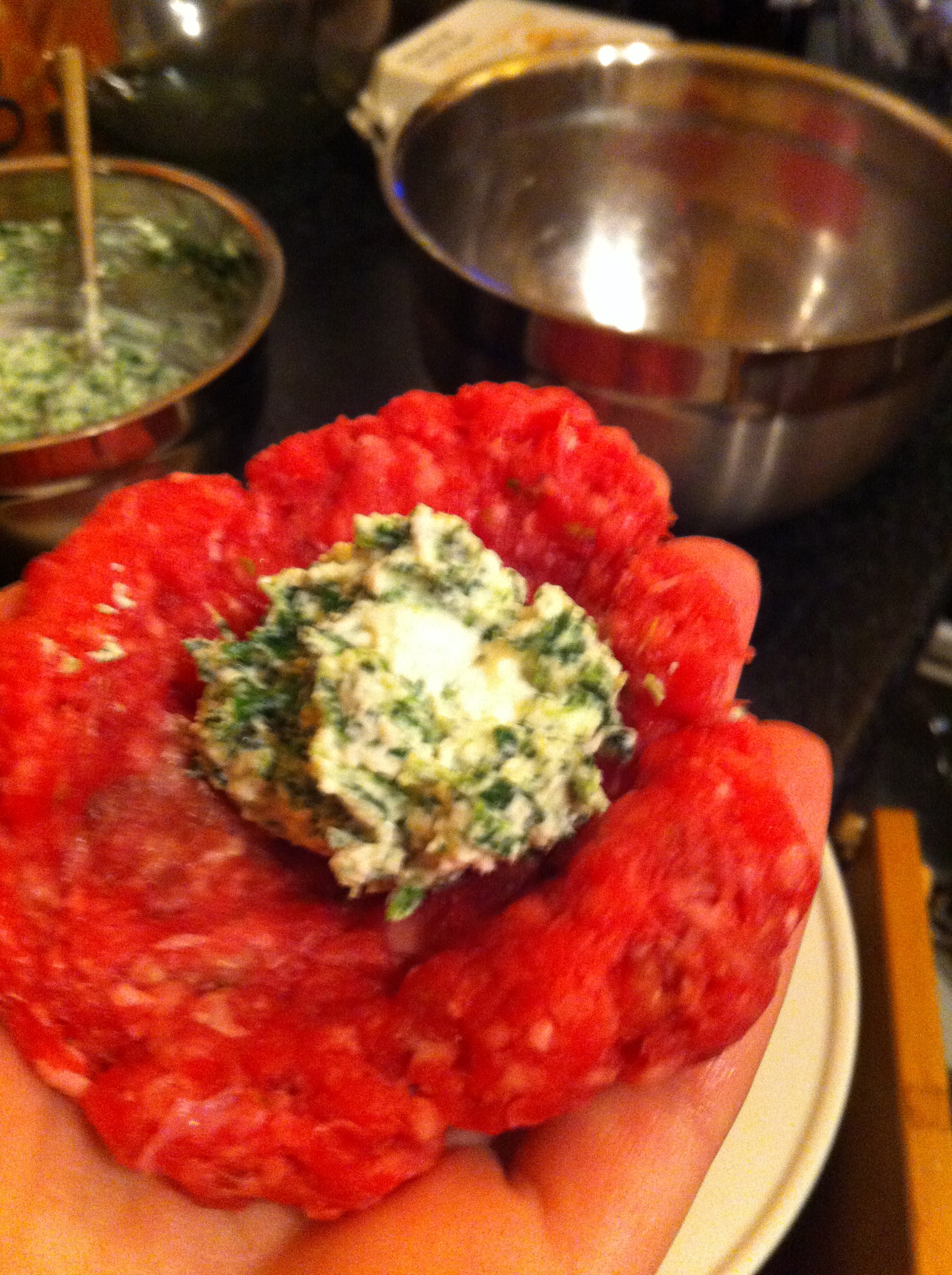 But back to these wow-factor meatballs. Once you have made the ricotta mixture and seasoned your ground beef, form beef patties into about 3″ disks. Fill them with a small spoonful of the ricotta and pinch the edges to enclose. Use the cup of your hands to seal and shape the balls.
