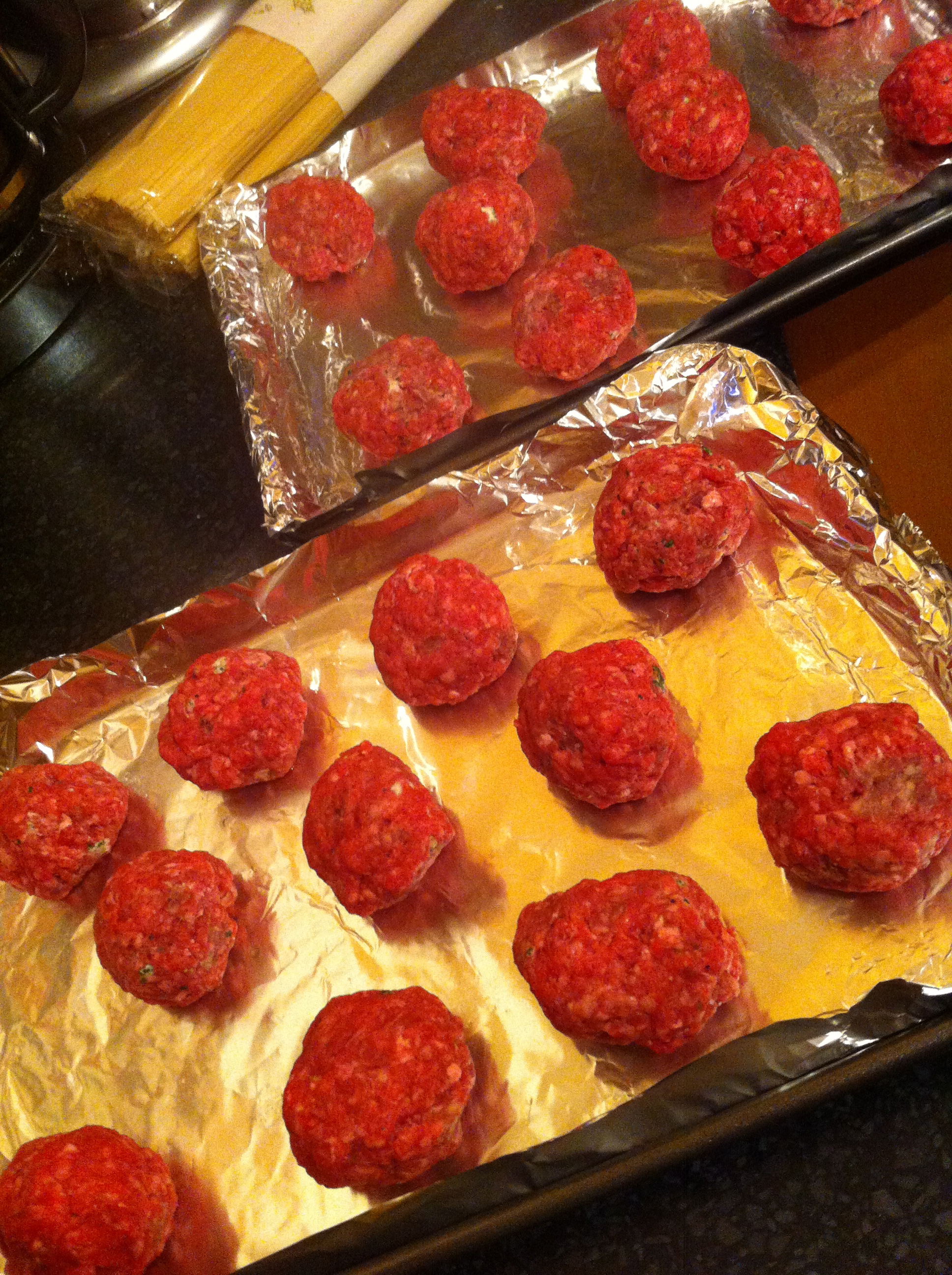 While the sauce simmers, heat a large skillet over medium heat with 2 tablespoons of olive oil. In batches, brown the meatballs on all sides then place on baking sheets lined with aluminum foil. Once all meatballs are browned, bake in the oven for 15 minutes.