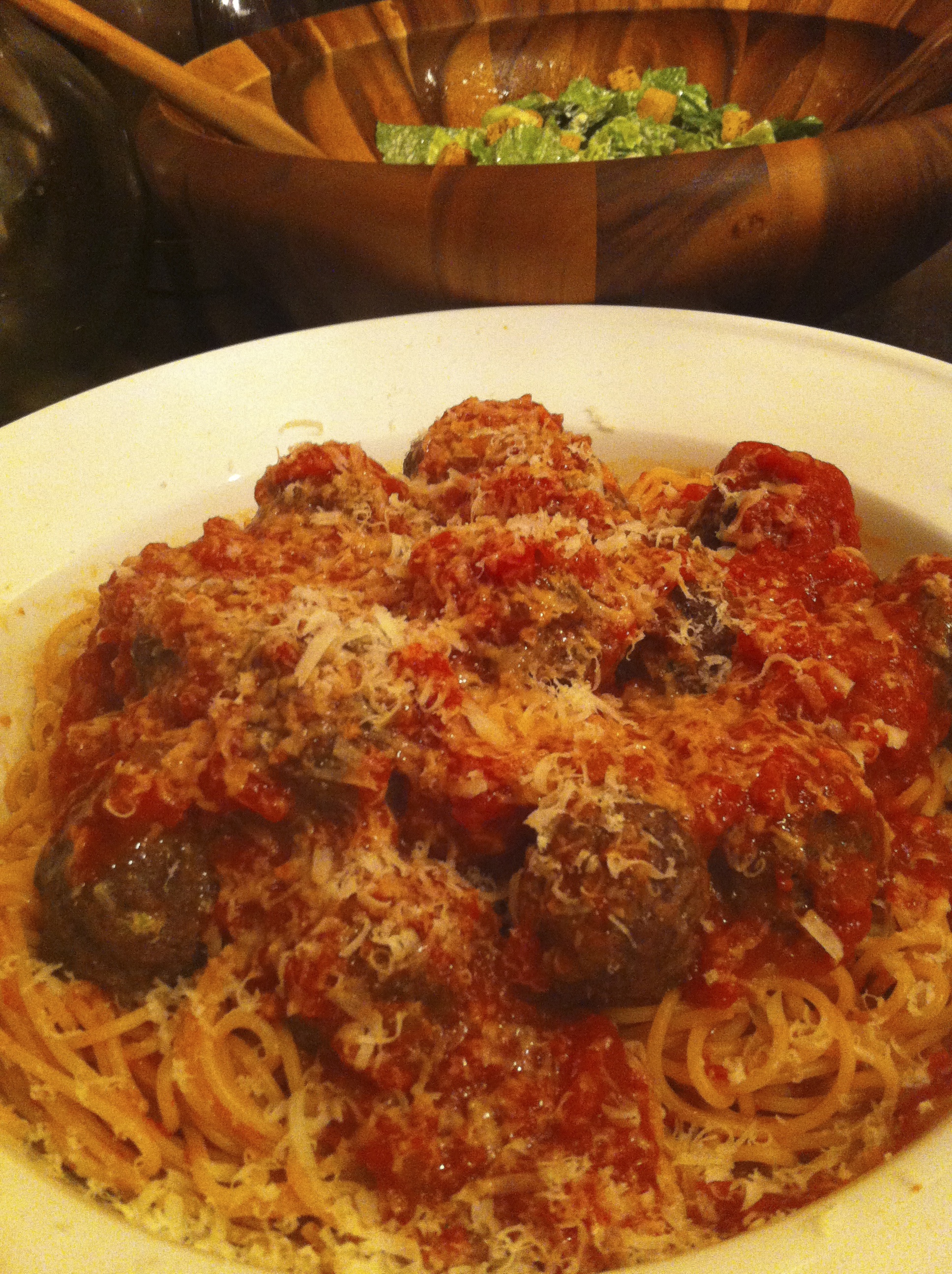 In a large serving bowl, toss the cooked spaghetti with about half of the sauce, then top with the meatballs, more sauce, and freshly grated Parmesan.