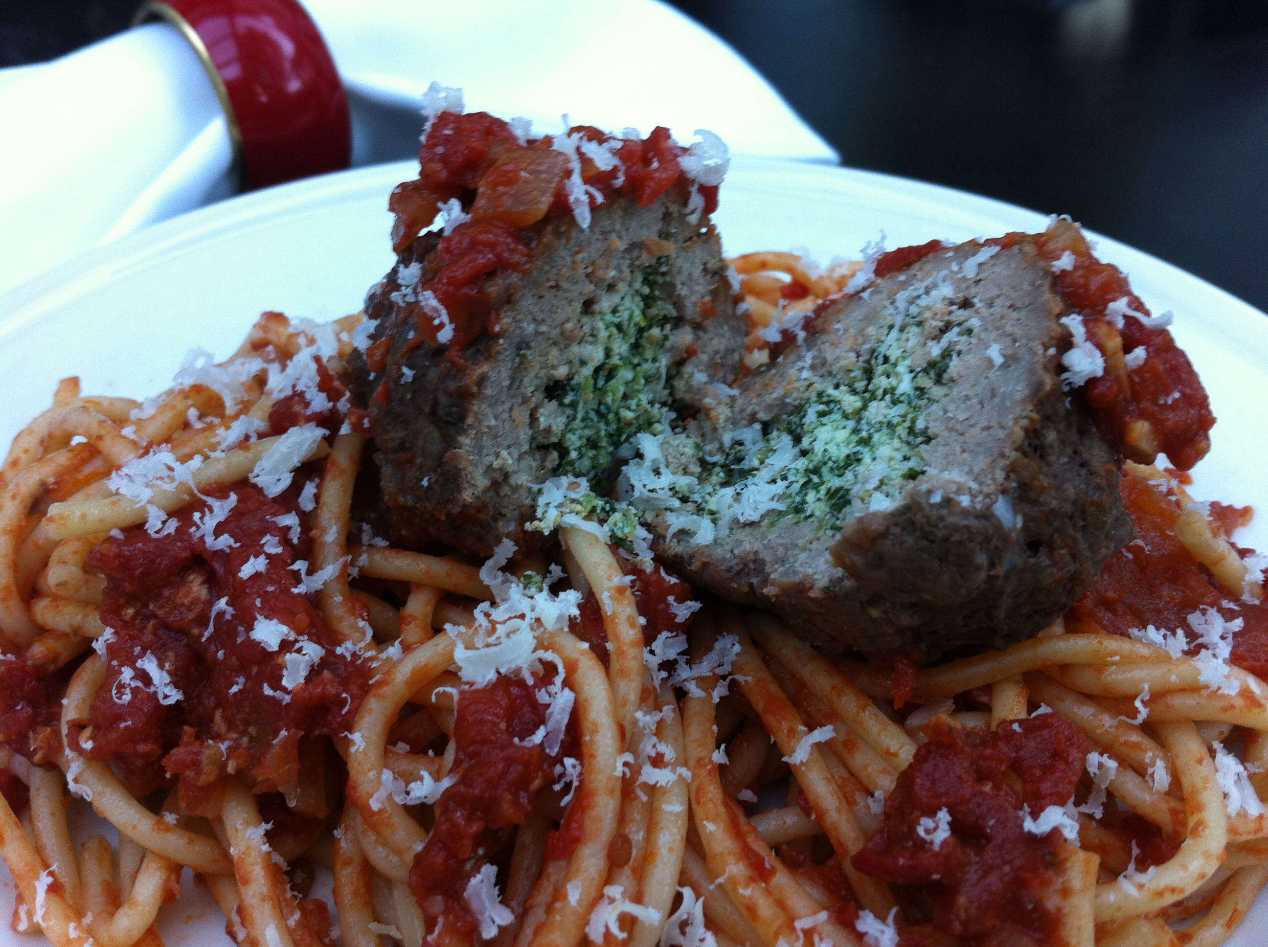 Over the weekend, we had friends over for Sunday football but instead of my usual tailgating spread, I changed up the menu: a massive bowl of spaghetti and meatballs with caesar salad and baguettes. But these weren’t just any meatballs. I filled seasoned beef with a ricotta and spinach mixture to make lasagna meatballs. They took a bit more effort to prep but really not anymore work than assembling a lasagna and such a fun surprise.