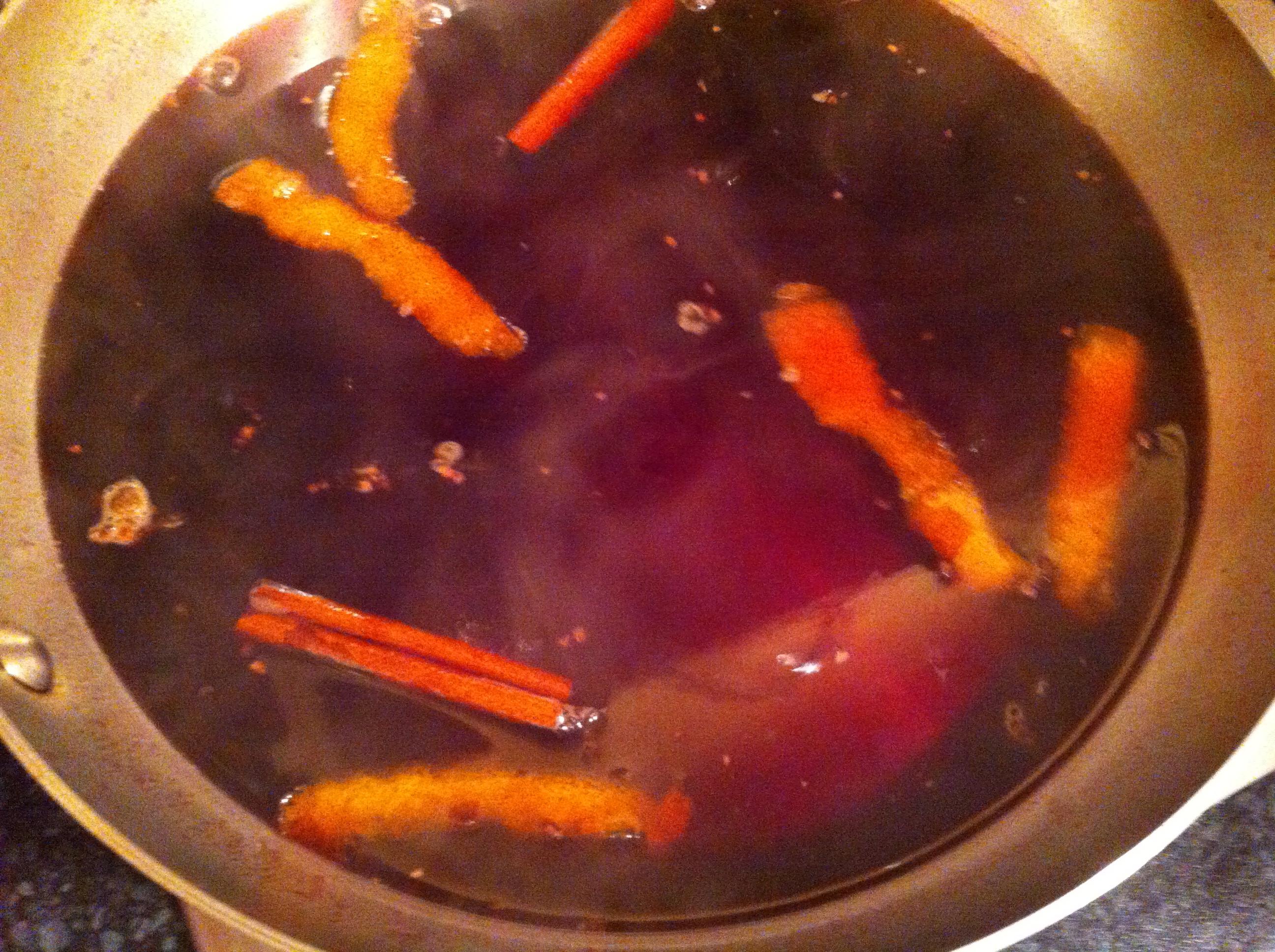 Strain mixture and return to the pan (or just remove orange rinds, cloves, etc.).