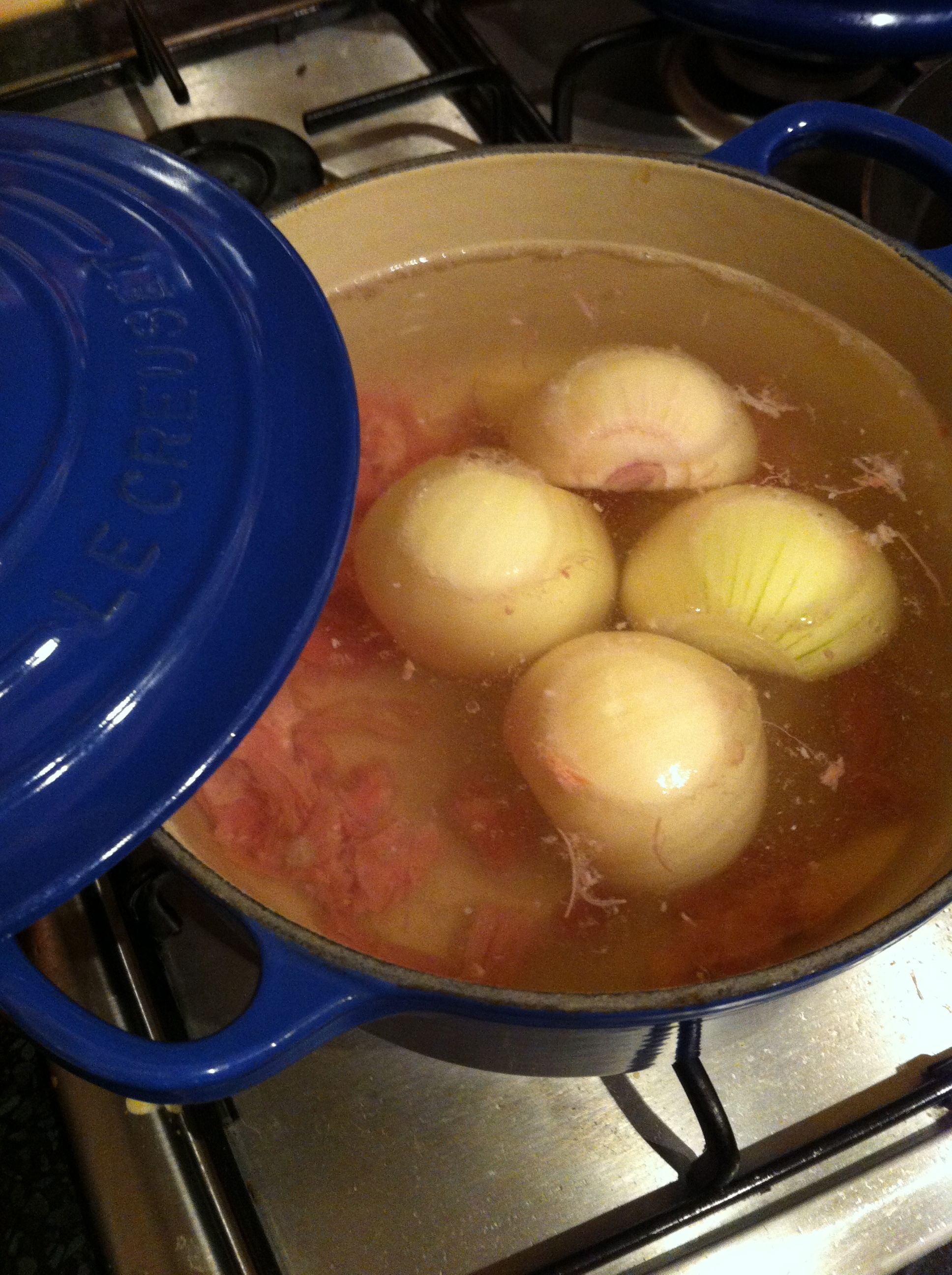 Once the broth has reduced by half, remove all the onions, garlic, and ham and simmer the green beans until soft. Add back about half of the onions, shredded and 1/2 cup of fresh ham hock just before serving.