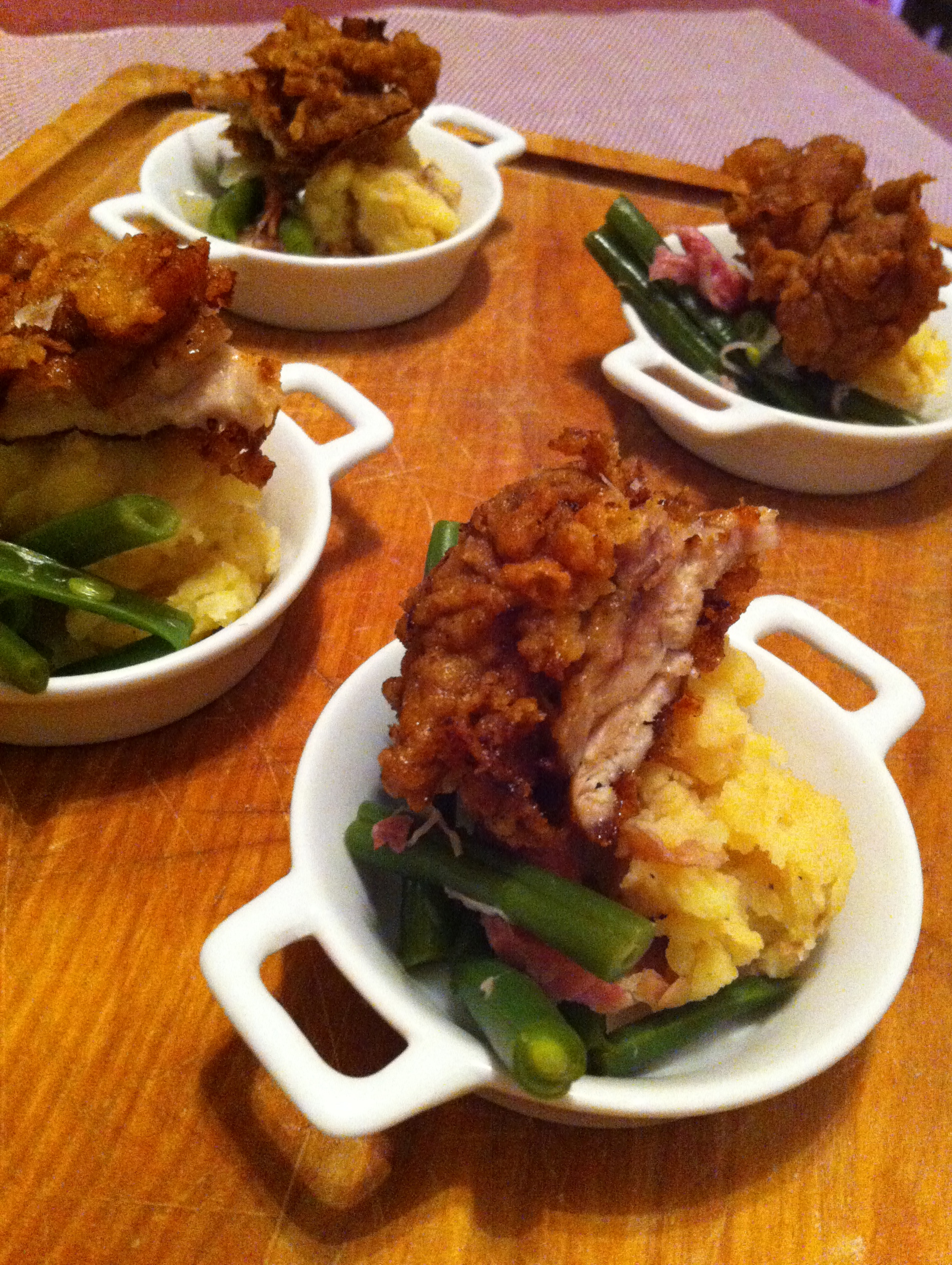 While I may not scream Southern belle, my mom’s buttermilk fried chicken is not only my taste of home but paired with smashed red potatoes and southern green beans, it is in many ways my life on a plate. It is a labor of love that she passed on to me. Okay I’m cheating here. I only made a meat and two rather than three. Tempted as I was to add some mac and cheese to the plate, I decided in favor of my waistline.
