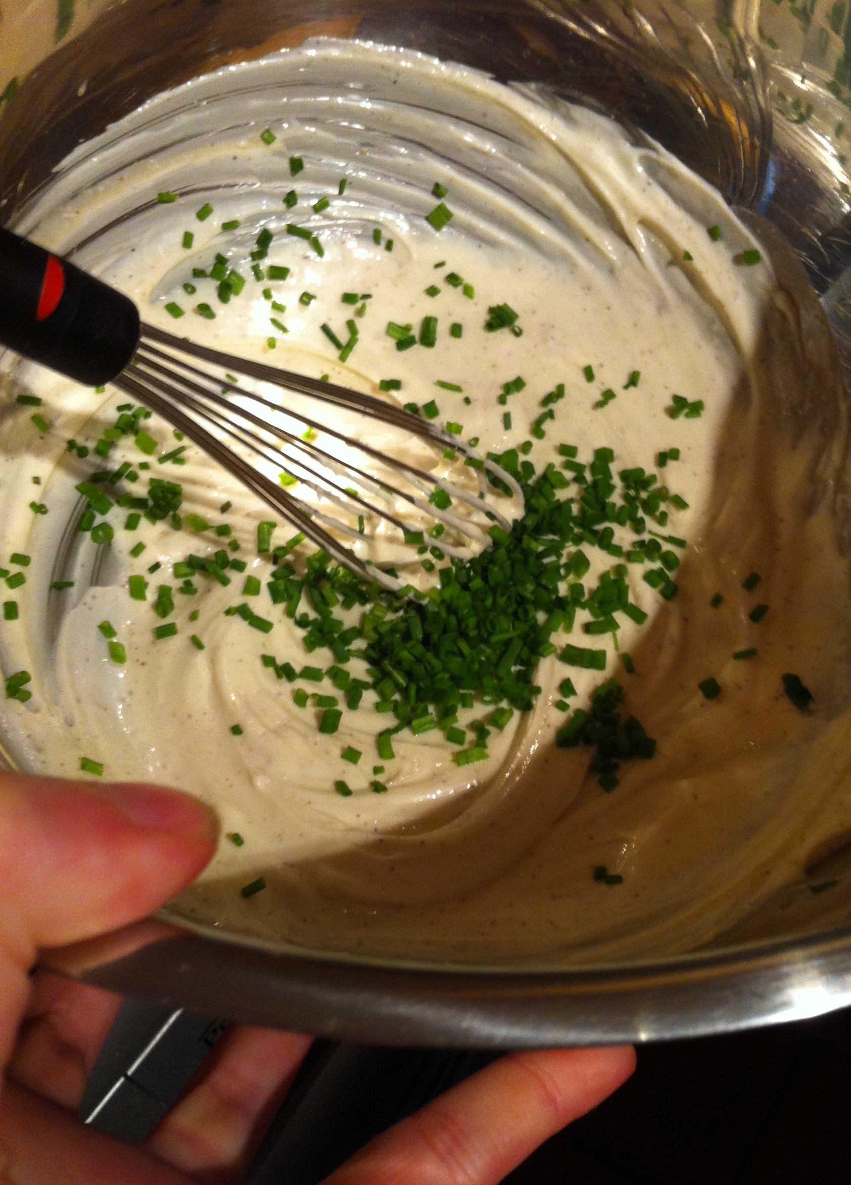 Roast up some bone-in, skin-on chicken breasts for maximum flavor. While the chicken cools, mix up the dressing. I like to use a traditional mayonnaise base cut with a zingy sherry vinegar and fresh chives for a bright oniony pop.